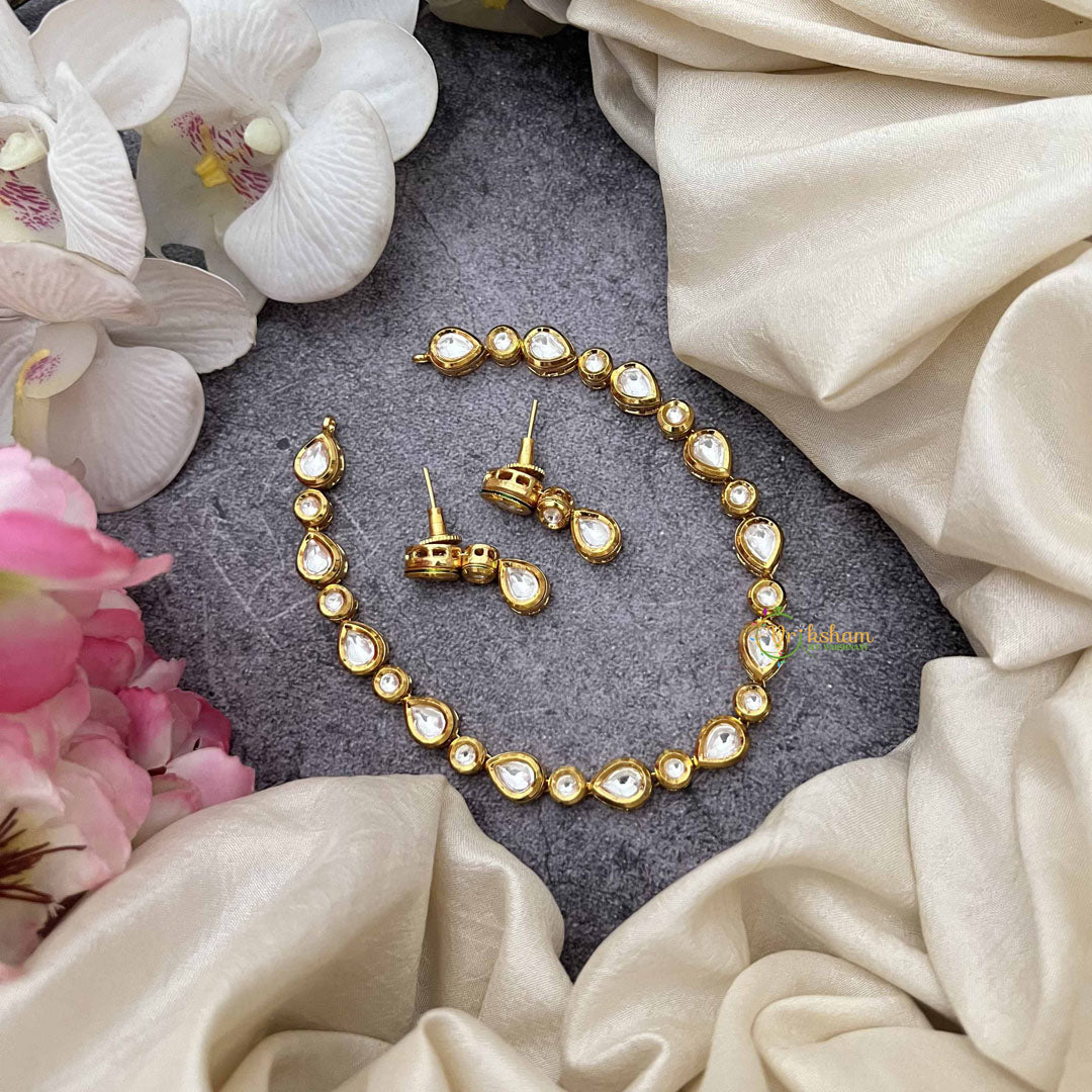 The Vriksham Simple Look Pear & Round Design Gold Plated Kundan Neckpiece features a delicate blend of pear and round shapes, accentuated by elegant gold plating. This refined piece offers a sophisticated yet understated charm, ideal for enhancing any ensemble with subtle grace.