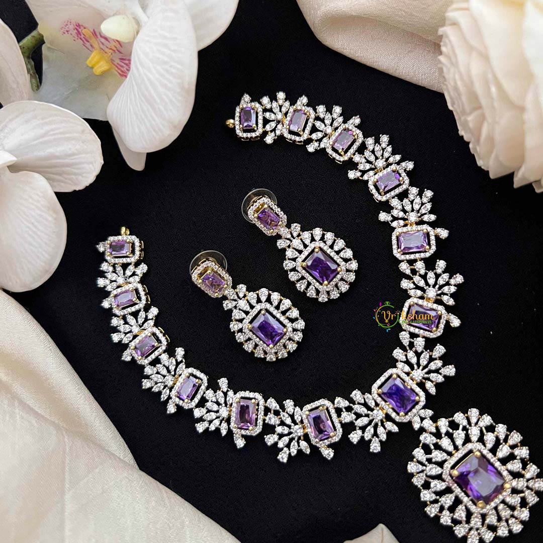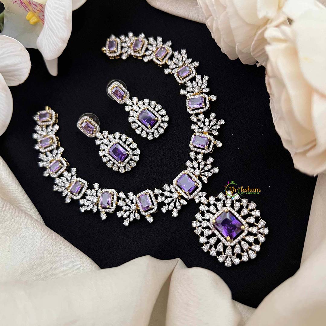Embrace refined elegance with this graceful short neckpiece, showcasing a stunning purple-cut crystal as its radiant centerpiece, surrounded by a luminous halo pendant that enhances its natural sparkle. A coordinating rectangular drop pendant completes the composition with subtle geometric sophistication. The regal purple tones evoke timeless beauty and understated luxury, making this piece an excellent choice for those who value classic design with contemporary sensibility. Ideal for formal occasions, celebrations, and refined everyday wear, this neckpiece effortlessly elevates any ensemble. The harmonious interplay of crystalline brilliance and elegant proportions creates a mesmerizing effect, ensuring you radiate timeless grace and sophisticated allure with every occasion.
