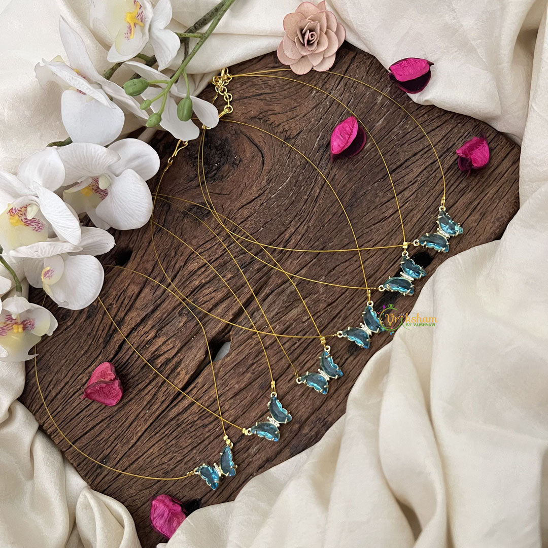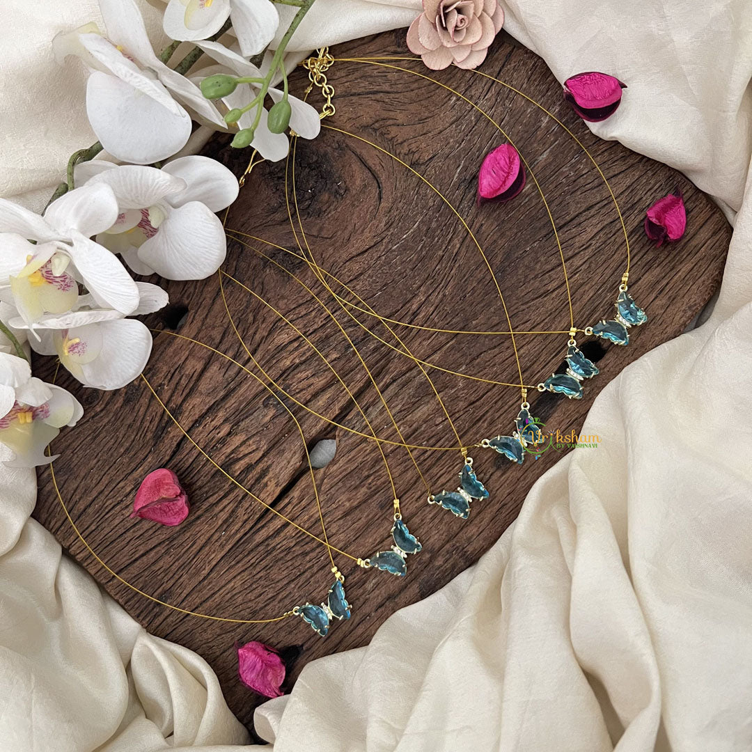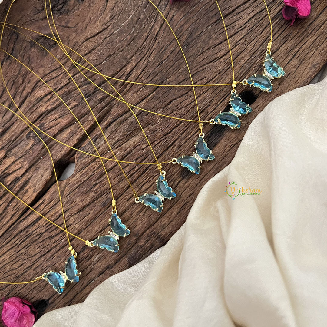 The Vriksham Sky Blue Butterfly Pendant Invisible Chain set features six delicate chains, each adorned with a graceful sky blue butterfly pendant. Designed with an invisible chain style, this sophisticated collection offers a subtle yet elegant accessory perfect for gifting. Its refined charm adds a delicate touch to any ensemble, making it an ideal return gift.