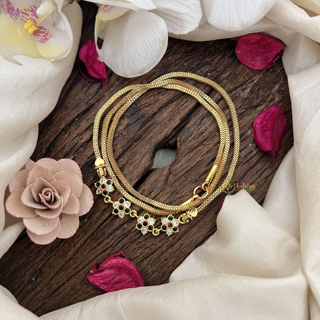 The Vriksham South Indian 4 Floral Moggapu Gold Chain in white, red, and green features a sophisticated design inspired by traditional South Indian motifs. With four intricately crafted floral elements and vibrant color accents, this elegant chain offers a timeless accessory that enhances your refined style for any occasion.