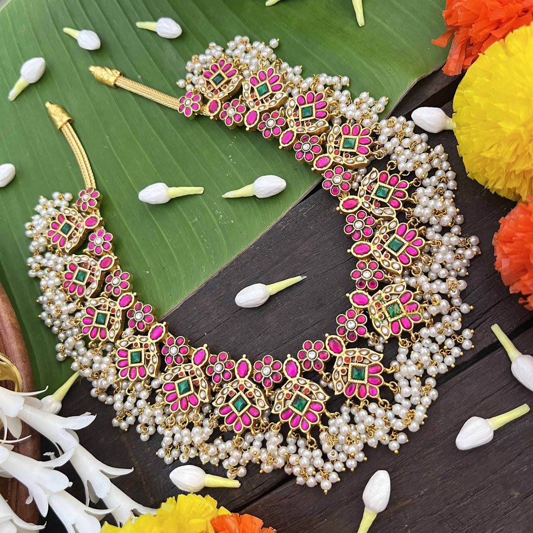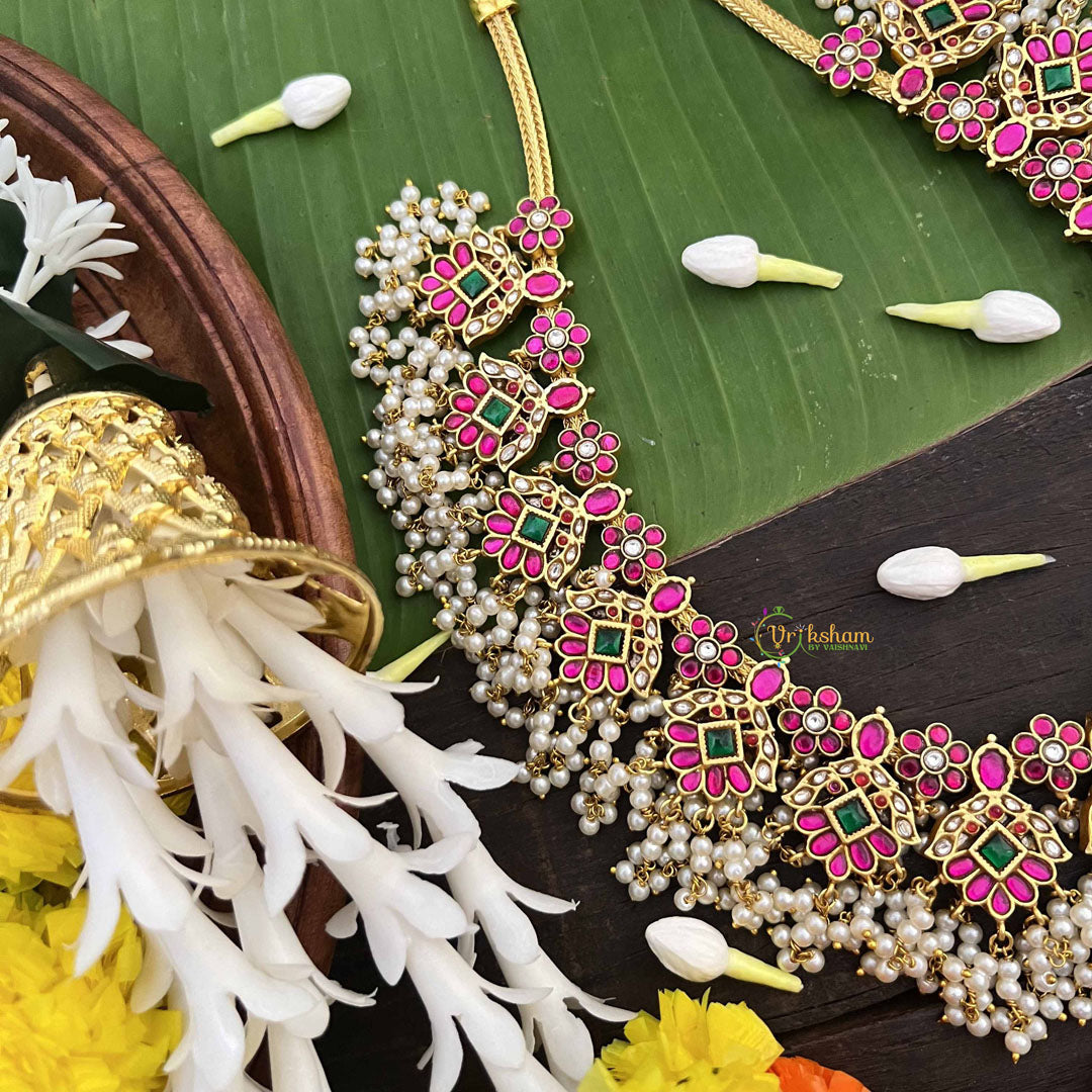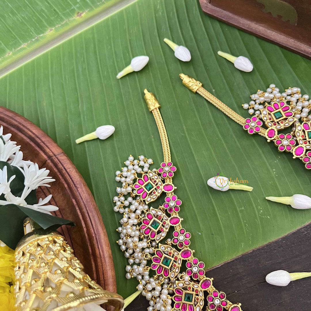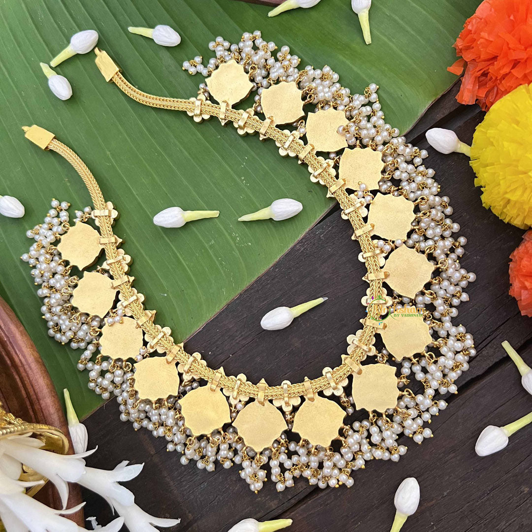 Discover the magnificence of authentic South Indian bridal artistry with this stunning long Guttapusalu neckpiece. Adorned with radiant pearls and deep kemp stones, this collection piece embodies the opulence of traditional craftsmanship. The intricate design celebrates classical aesthetics while maintaining contemporary appeal, making it an essential addition to any bride's jewelry wardrobe. Meticulously created to honor heritage, this neckpiece radiates timeless elegance and cultural richness, transforming special occasions into moments of unparalleled beauty and sophistication.