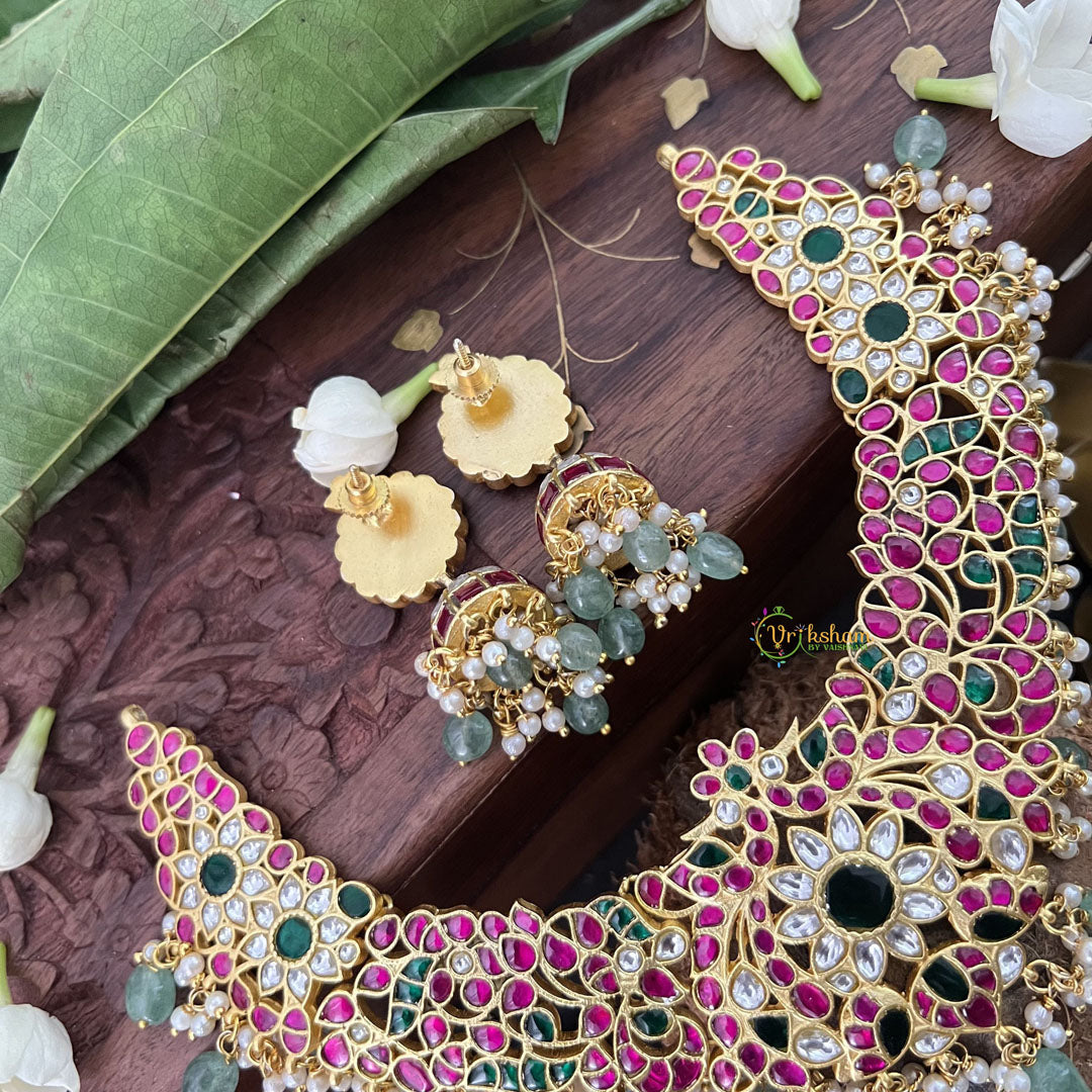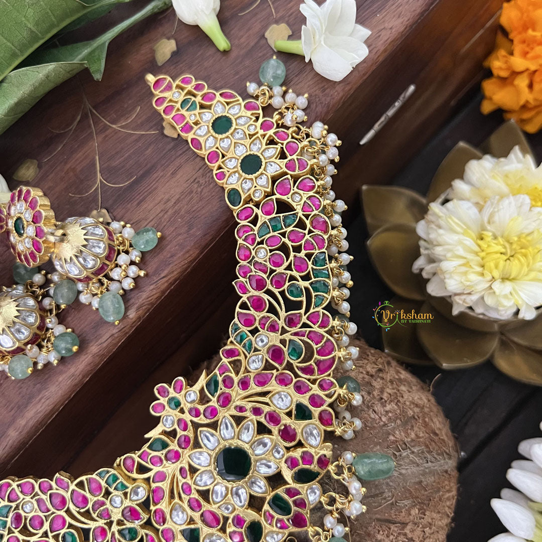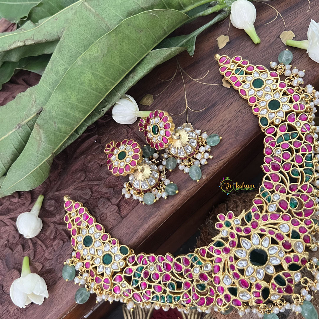 The Vriksham South Indian Style Neckpiece showcases exquisite kundan jadau artistry, beautifully complemented by green aqua beads and lustrous pearls. This sophisticated piece reflects traditional elegance with a vibrant touch, making it an ideal accessory for grand celebrations and cultural occasions.
