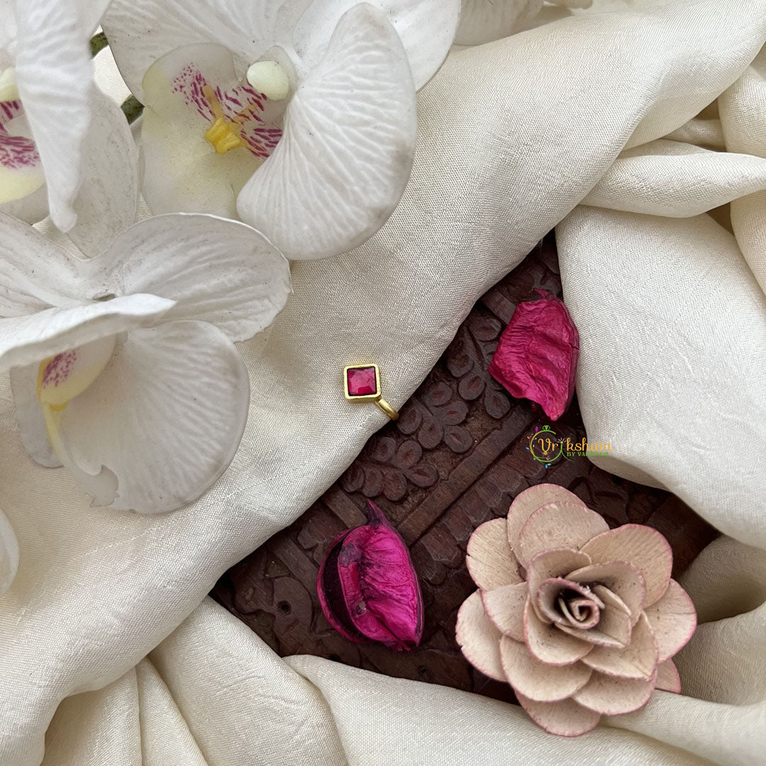 The Vriksham Square Shape Jadau Kundan Nath in vibrant red features a distinctive geometric design that highlights expert craftsmanship. This sophisticated piece combines traditional Jadau and Kundan techniques with a modern square silhouette, making it a striking accessory to complement your elegant attire.