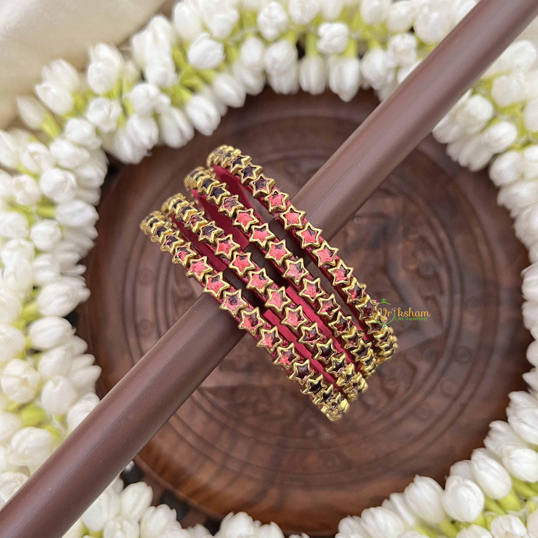 Elevate your wrist collection with these exquisite Star Style Kundan bangles, where traditional craftsmanship meets contemporary elegance. Each bangle features intricate kundan work adorned with shimmering pink gold detailing, complemented by luxurious silk thread wrapping for a refined finish. The sophisticated design seamlessly transitions from festive occasions to everyday wear, offering versatile beauty that captures light with every movement. Perfect for those who appreciate the artistry of handcrafted jewelry and timeless style.