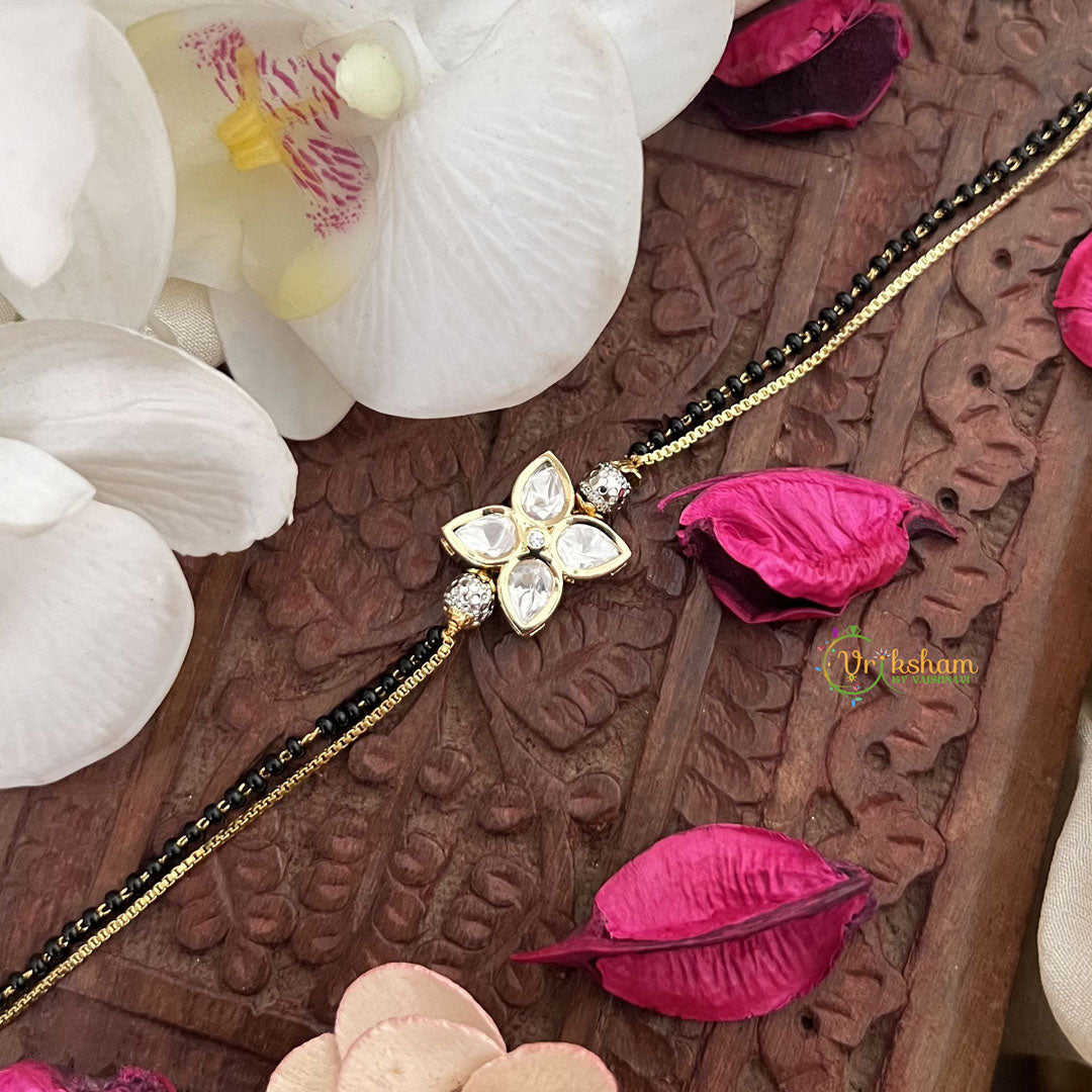 Indulge in elegance and sophistication with our Vriksham Elegant Gold Look Alike Flower with Chain Mangalsutra Bracelet. This exquisitely crafted piece features a stunning flower design, symbolizing beauty and grace. Enhance your hand with this luxurious bracelet, perfect for all occasions.