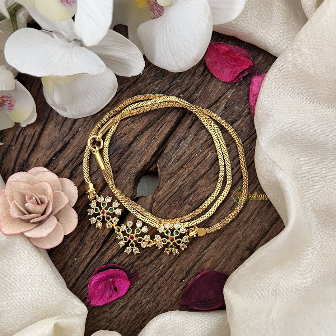 The Vriksham Subtle & Stylish Three Floral Moggapu Gold Chain features delicate floral motifs accented with red, green, and white hues. This elegant design offers a refined and graceful accessory, perfect for adding a touch of understated sophistication to your daily or special occasion attire.