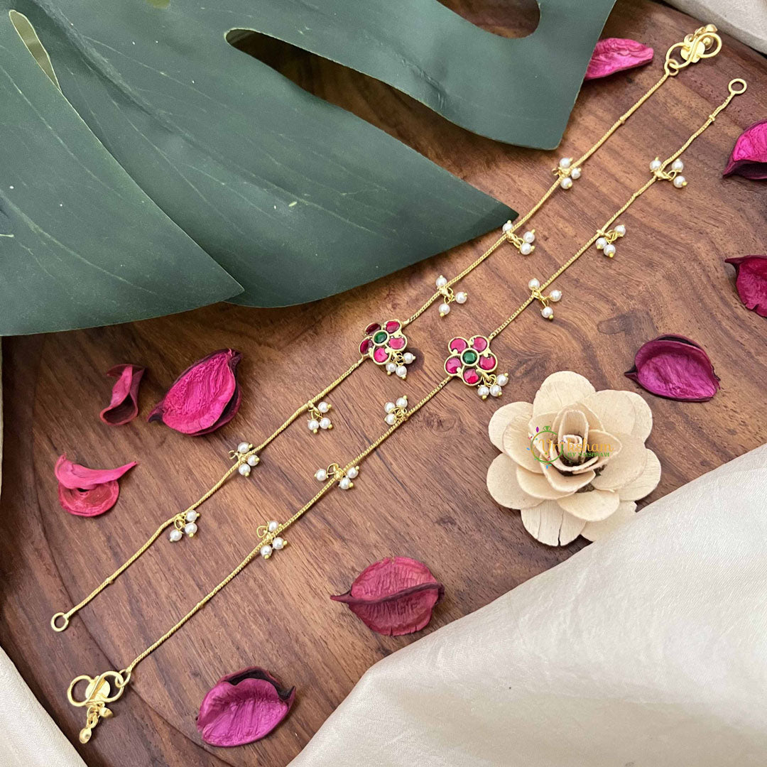 Elevate your ethnic ensemble with these exquisite Sun Floral Jadau Kundan anklets, a masterpiece of traditional craftsmanship. Adorned with intricate kundan work and lustrous pearls, these anklets feature a captivating red and green color palette that complements both festive and everyday wear. The ornate sun floral motif showcases meticulous detailing, blending timeless artistry with contemporary elegance. Perfect for weddings, celebrations, or adding a touch of refined sophistication to your jewelry collection, these anklets are a testament to heritage design and superior quality.