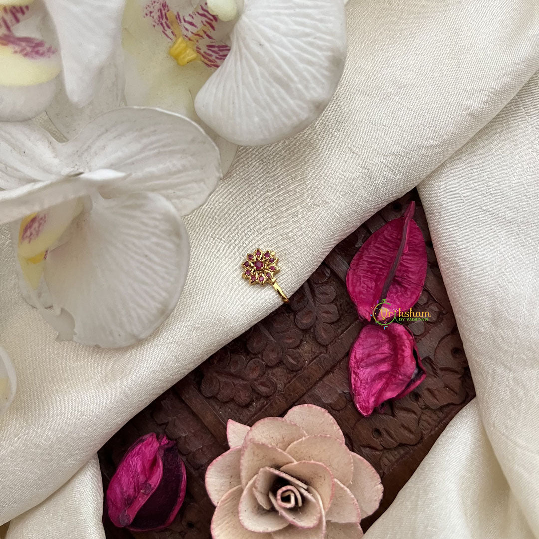 The Vriksham Sun Floral Nath features a radiant sun-inspired design adorned with vibrant red gemstones and delicate pearls. This press-fit nose pin offers a secure and comfortable fit, adding a refined and elegant touch to your traditional attire. Perfect for enhancing your look with subtle sophistication.