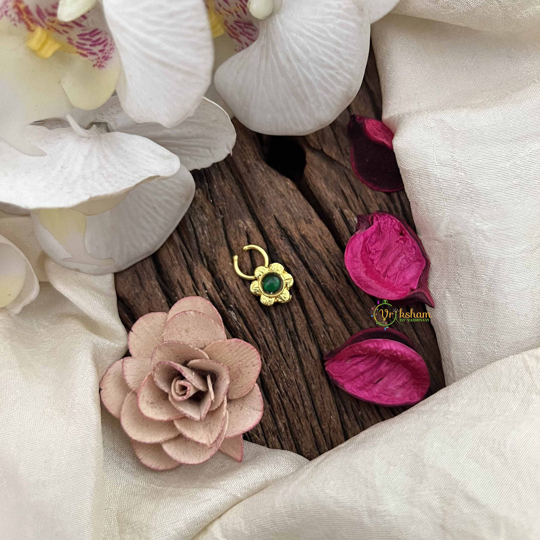 The Vriksham Sun Floral Style Golden Kundan Jadau Septum Ring features a gold-toned finish beautifully accented with green stones and delicate . Inspired by sun and floral motifs, this exquisitely crafted piece combines vibrant color with elegant detailing, offering a sophisticated accessory that adds a graceful and refined touch to any ensemble.