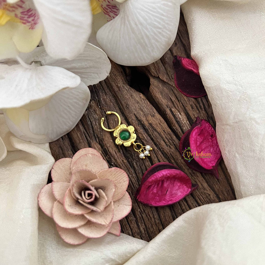 The Vriksham Sun Floral Style Golden Kundan Jadau Septum Ring features a gold-toned finish beautifully accented with green stones and delicate pearls. Inspired by sun and floral motifs, this exquisitely crafted piece combines vibrant color with elegant detailing, offering a sophisticated accessory that adds a graceful and refined touch to any ensemble.