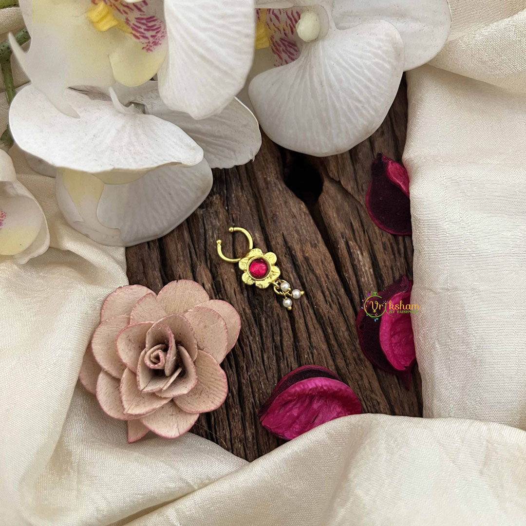 The Vriksham Sun Floral Style Golden Kundan Jadau Septum Ring features a gold-toned finish accented with vibrant red stones and delicate pearls. Inspired by sun and floral motifs, this exquisitely crafted piece merges timeless elegance with refined detail, creating a sophisticated accessory that adds a radiant and graceful touch to your ensemble.