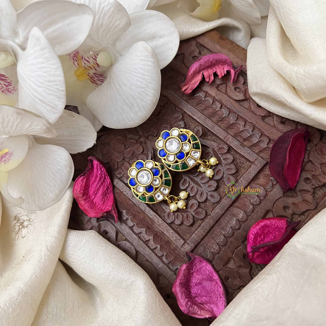 Discover timeless sophistication with this celestial-inspired bugadi, a harmonious blend of sun and moon artistry. This exquisite piece showcases intricate kundan jadau work featuring a radiant sun motif paired with an elegant half-moon crescent, adorned with mesmerizing blue, green, and white gemstones. The lustrous gold-plated base enhances the jewel-like brilliance of each stone, creating a captivating luminous effect. The convenient press design ensures comfortable, secure wear throughout your celebrations. Perfect for weddings, festivals, and formal occasions, this bugadi represents the pinnacle of traditional Indian jewelry craftsmanship. An heirloom-worthy accessory that elevates your cultural elegance with understated grandeur.