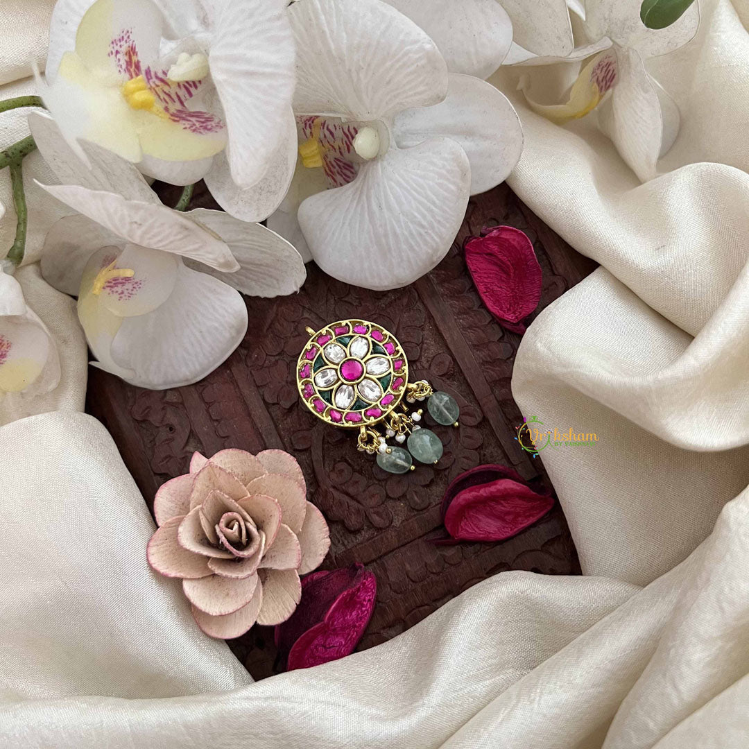 The Vriksham Sun Floral Type Kundan Jadau Jada Billai features a radiant sun-inspired floral design set with red and white stones, accented by an aqua green bead. This sophisticated accessory adds a warm, elegant glow to traditional hairstyles, perfect for special occasions and celebrations. Its intricate craftsmanship ensures timeless beauty and charm.