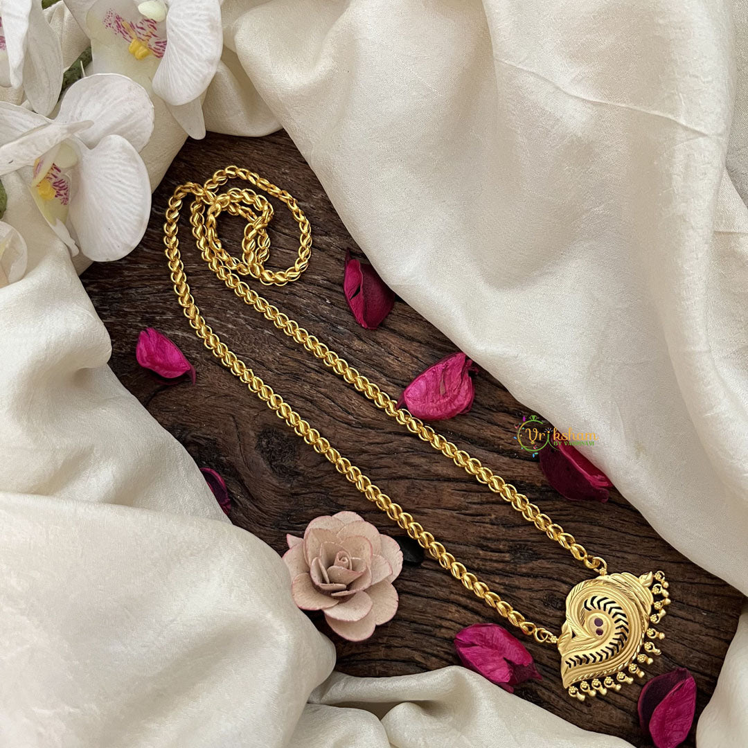 The Vriksham Sunburst Floral Gold-Plated Temple Necklace Pendant Chain Neckpiece features a stunning floral design with temple-inspired artistry, enhanced by vibrant red and gold beads. This sophisticated piece blends traditional elegance with intricate craftsmanship, making it an ideal accessory to complement festive and formal attire with a touch of refined beauty.