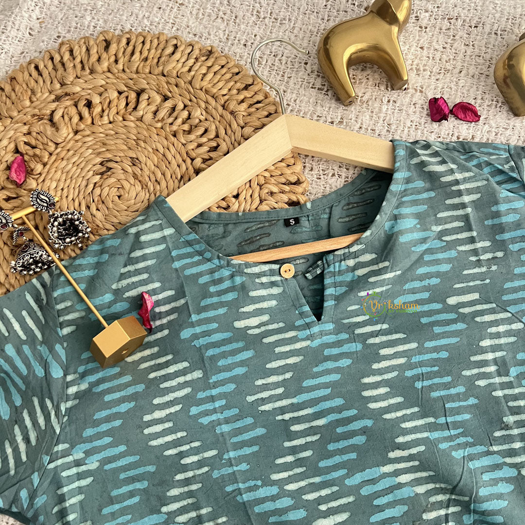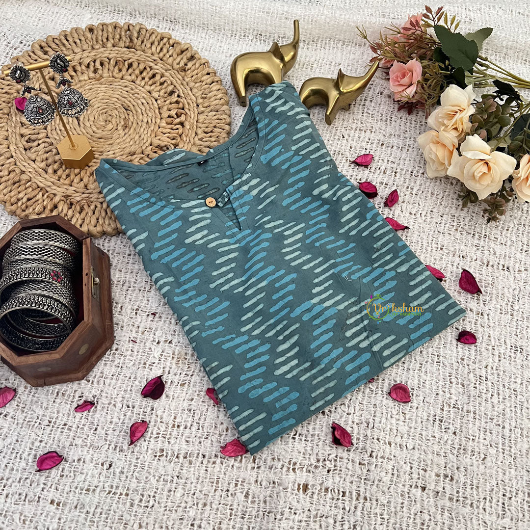Introducing Vriksham Teal Green Handblock Cotton Short Kurti, the perfect blend of style and comfort. Made with 100% cotton and handblock printing, this elegant 3/4 sleeve kurti is suitable for both daily wear and office wear. Elevate your wardrobe with this luxurious piece and make a statement wherever you go.