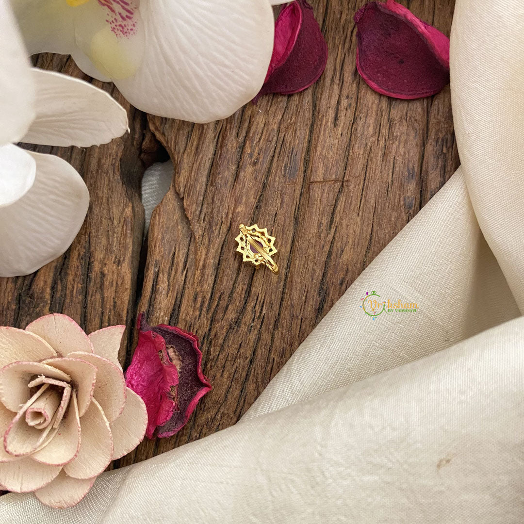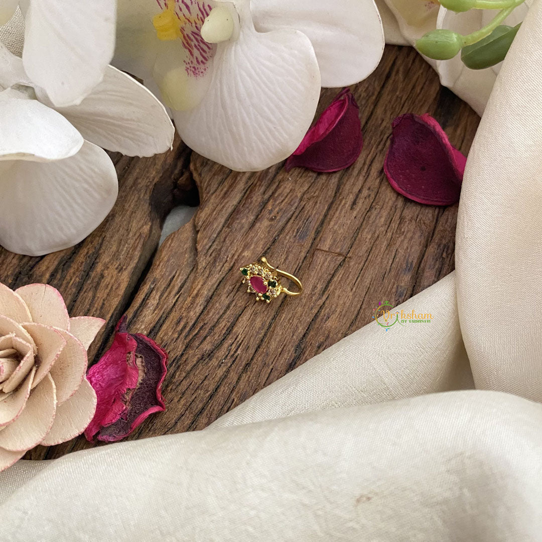 Elevate your style with the Vriksham Tear Drop AD Stone Nath, a luxurious nose pin in pristine red,green & white. This elegant piece features a sparkling stone in a unique tear drop design, adding a touch of sophistication to any look. Adorn yourself with this exclusive accessory and make a statement.