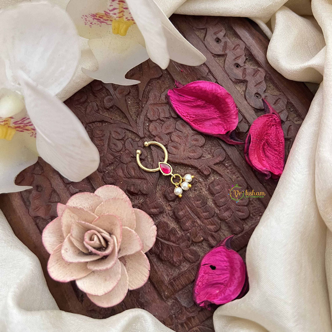 The Vriksham Teardrop Elegance Pearl Septum Ring in Red features a graceful teardrop design accented with lustrous pearls and rich red details. This sophisticated piece adds a refined and elegant touch to traditional attire, making it perfect for elevating your ensemble with timeless beauty and subtle luxury. Ideal for special occasions and festive celebrations.