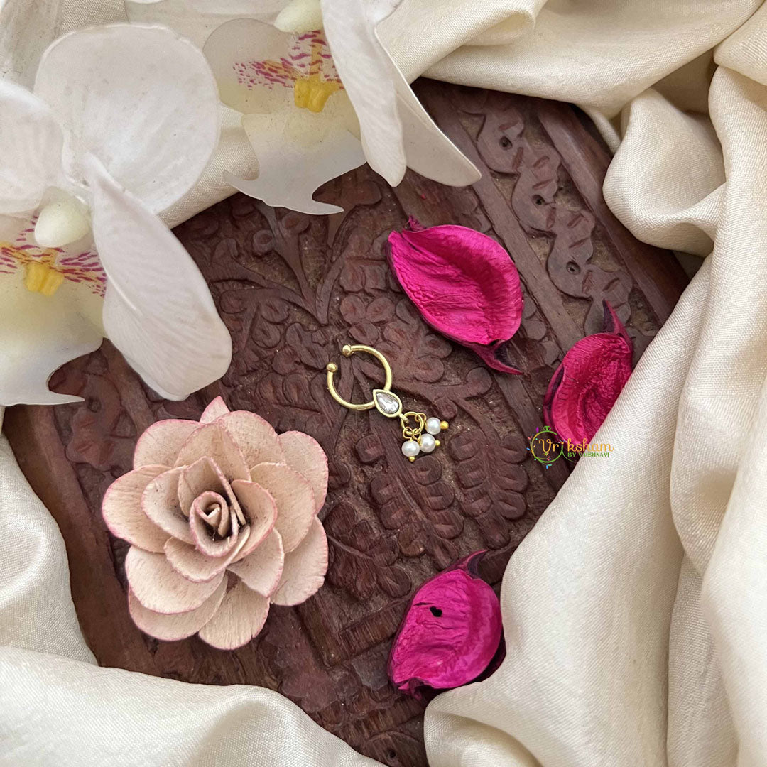 The Vriksham Teardrop Elegance Pearl Septum Ring in White showcases a delicate teardrop shape adorned with radiant pearls. This sophisticated design brings subtle elegance and timeless beauty to your traditional ensemble, making it an ideal accessory for special occasions and refined celebrations.