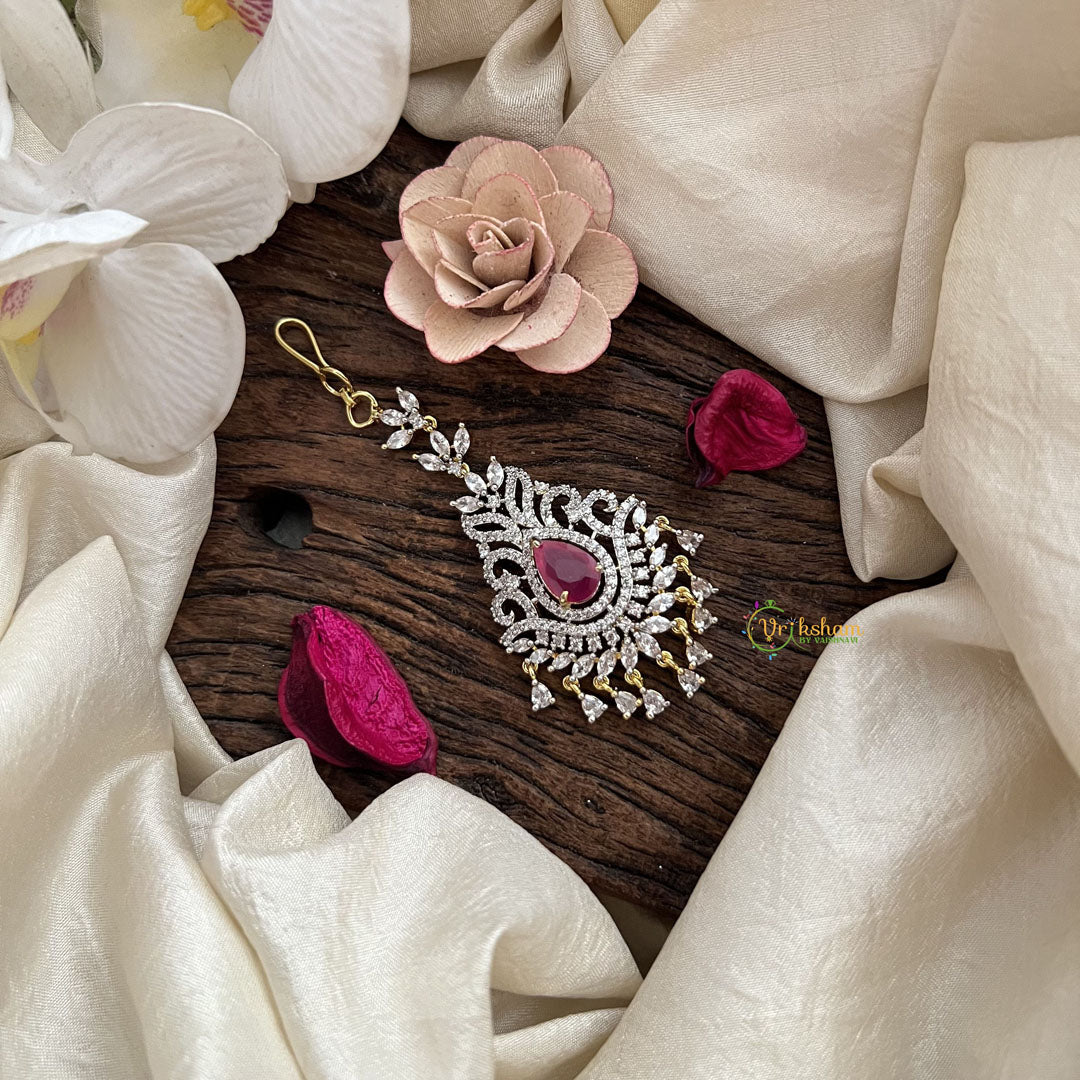 The Vriksham Teardrop Shine AD Stone Maang Tikka features a sophisticated teardrop design adorned with sparkling AD stones and vibrant red accents. This elegant piece adds a refined shimmer to your traditional ensemble, perfect for enhancing your look with subtle luxury and timeless grace on special occasions.