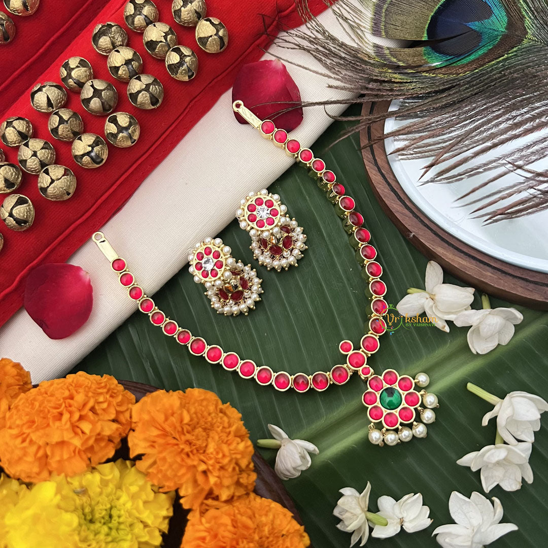 The Vriksham Temple-inspired Kemp pendant necklace in red and green showcases exquisite craftsmanship with its vibrant hues and intricate design. Accented by a delicate pearl fringe, this elegant neckpiece offers a graceful touch of movement, making it a perfect choice for sophisticated occasions. Its blend of traditional artistry and refined style enhances any ensemble with timeless charm.
