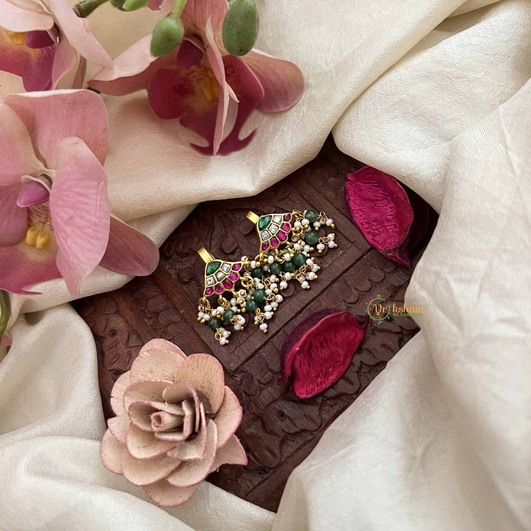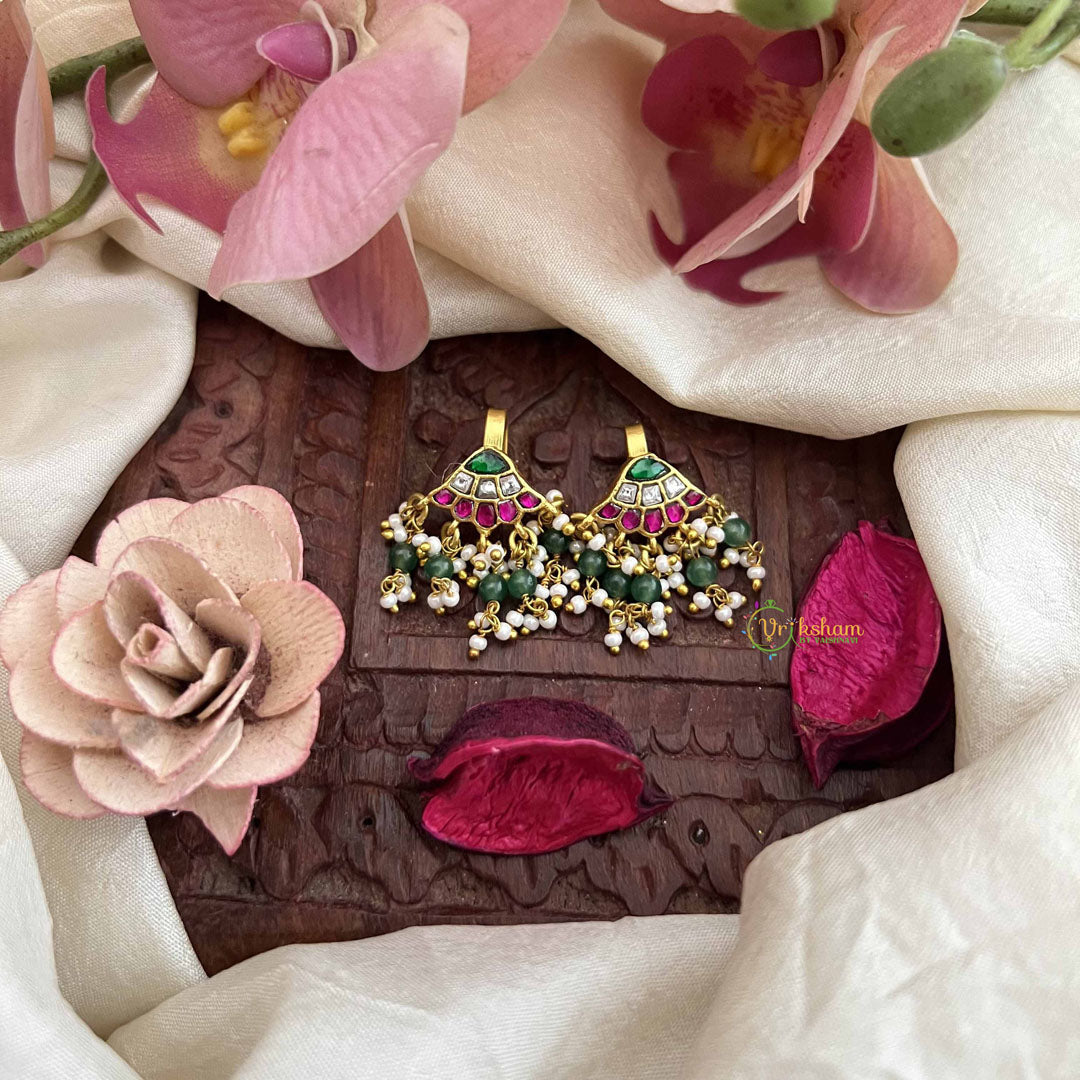 Discover the exquisite Vriksham Temple Inspired Press Bugadi, adorned with delicate pearls and authentic Kundan Jadau craftsmanship. Showcasing a harmonious blend of red, green, and white, this piece reflects traditional artistry and timeless sophistication. Ideal for enhancing formal and festive ensembles, it brings a graceful and refined elegance to your collection.