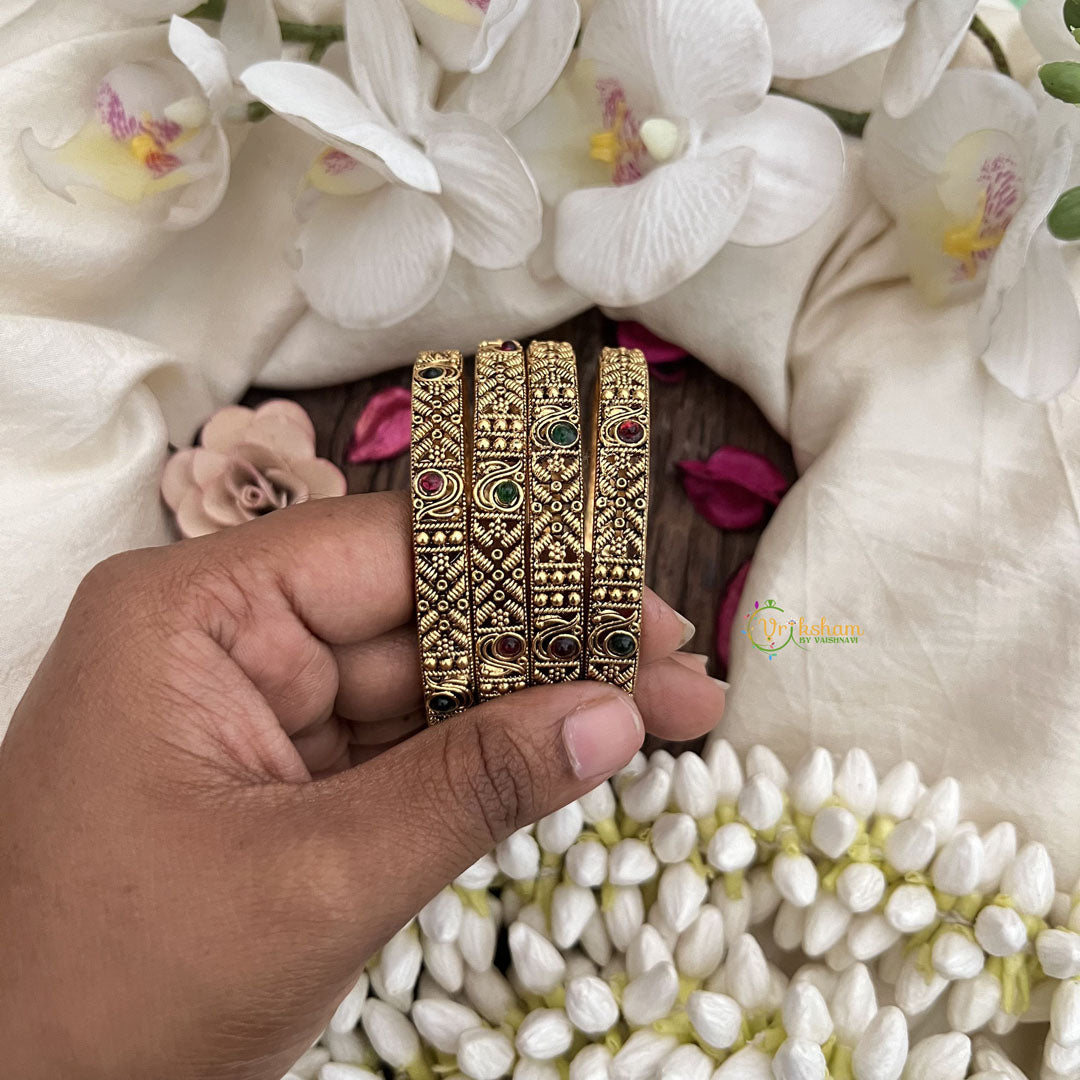 Add a touch of vibrant elegance with the Vriksham Textured Design Bangles set. Featuring four beautifully crafted bangles embellished with striking red and green stone accents, these bangles showcase intricate texture work that enhances their rich appeal. Ideal for complementing traditional and formal attire, this set brings a refined and sophisticated finishing touch to your look.