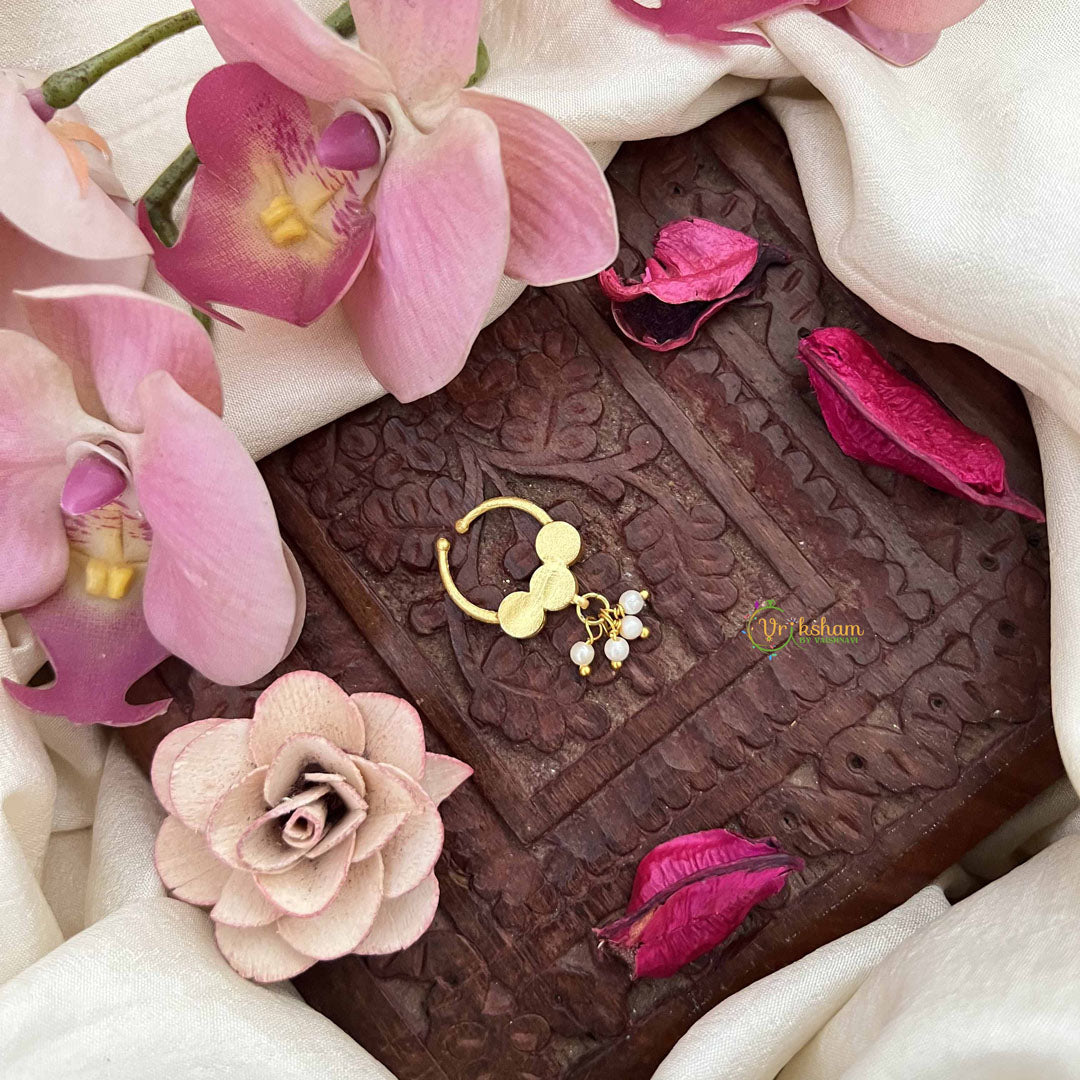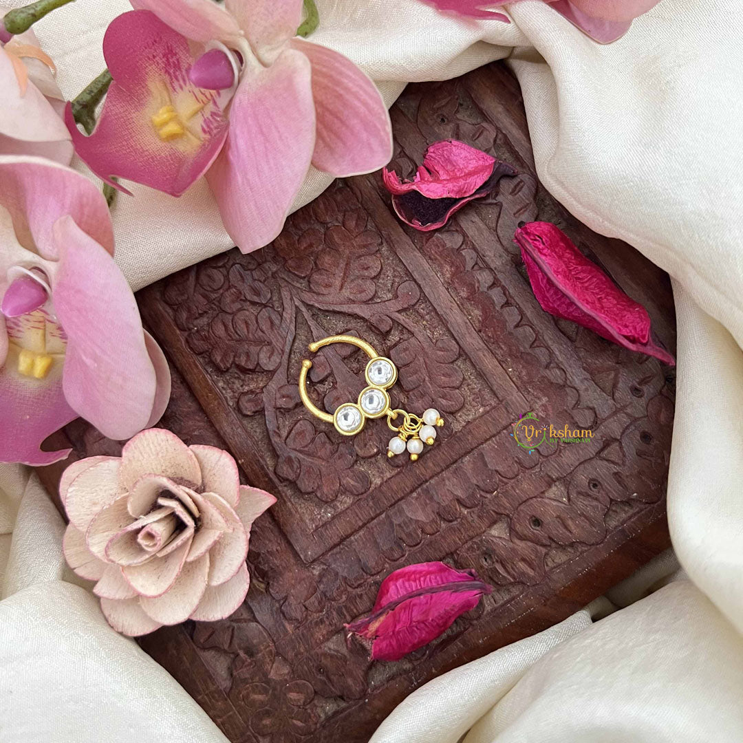 This elegant septum ring features a refined three-dot design accented with delicate white pearl danglers, all crafted in gold-toned Kundan Jadau. Its sophisticated artistry enhances traditional attire with subtle grace, making it a perfect choice for those seeking timeless elegance.