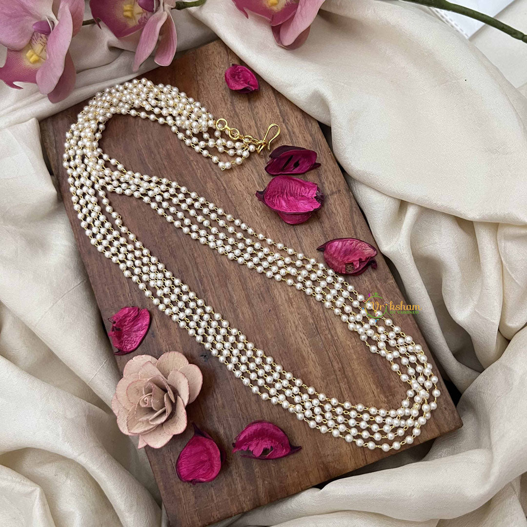 The Vriksham Timeless 5 Layered Pearl Beaded Mala features five elegant layers of 3mm pearls, meticulously crafted into a 24-inch necklace. With its classic design and refined detailing, this mala offers a sophisticated accessory that effortlessly enhances both traditional and contemporary styles.