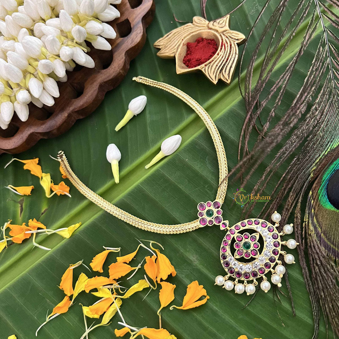 The Vriksham Timeless Oval Floral Style Gold Look Precious Kemp Pendant, paired with a lustrous pearl neckpiece, features elegant red, green, and white accents. This sophisticated design combines classic floral motifs with refined detailing, offering a graceful statement piece ideal for enhancing your formal and traditional attire.