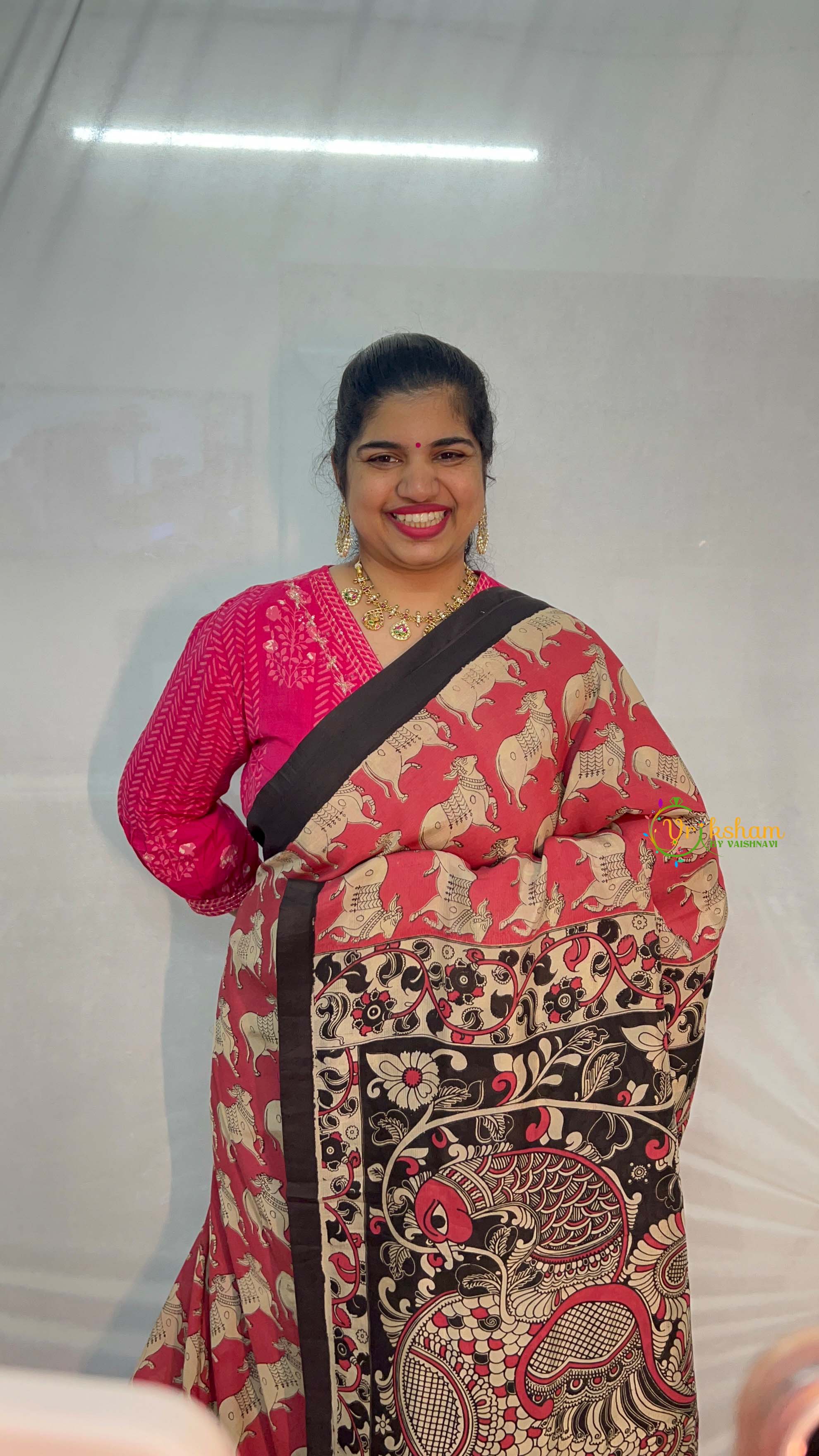 Make a bold statement with this striking Kalamkari saree in vibrant tomato red, where dynamic running cow motifs capture movement and cultural symbolism. Each figure is skillfully hand-painted with traditional precision, celebrating the sacred imagery and artistic heritage of authentic Kalamkari weaving. The contrasting black border provides dramatic definition, creating a contemporary edge while honoring classical design principles. Ideal for festive celebrations, cultural events, and occasions demanding confident elegance, this saree seamlessly blends tradition with modern sensibility. A distinctive investment piece that honors India's textile artistry while offering the discerning wearer a garment of exceptional craftsmanship, cultural depth, and timeless, versatile sophistication.