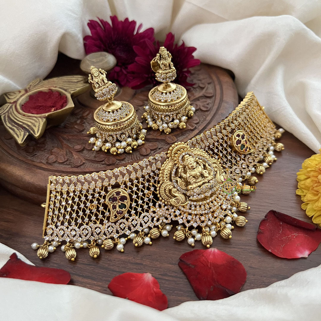The Vriksham Traditional AD Stone Lakshmi High Neck Choker features exquisite pearl accents paired with classic AD stones, beautifully framing the iconic Goddess Lakshmi motif. This sophisticated piece blends timeless tradition with elegant design, making it an ideal accessory to enhance your festive and formal attire with grace and refinement.