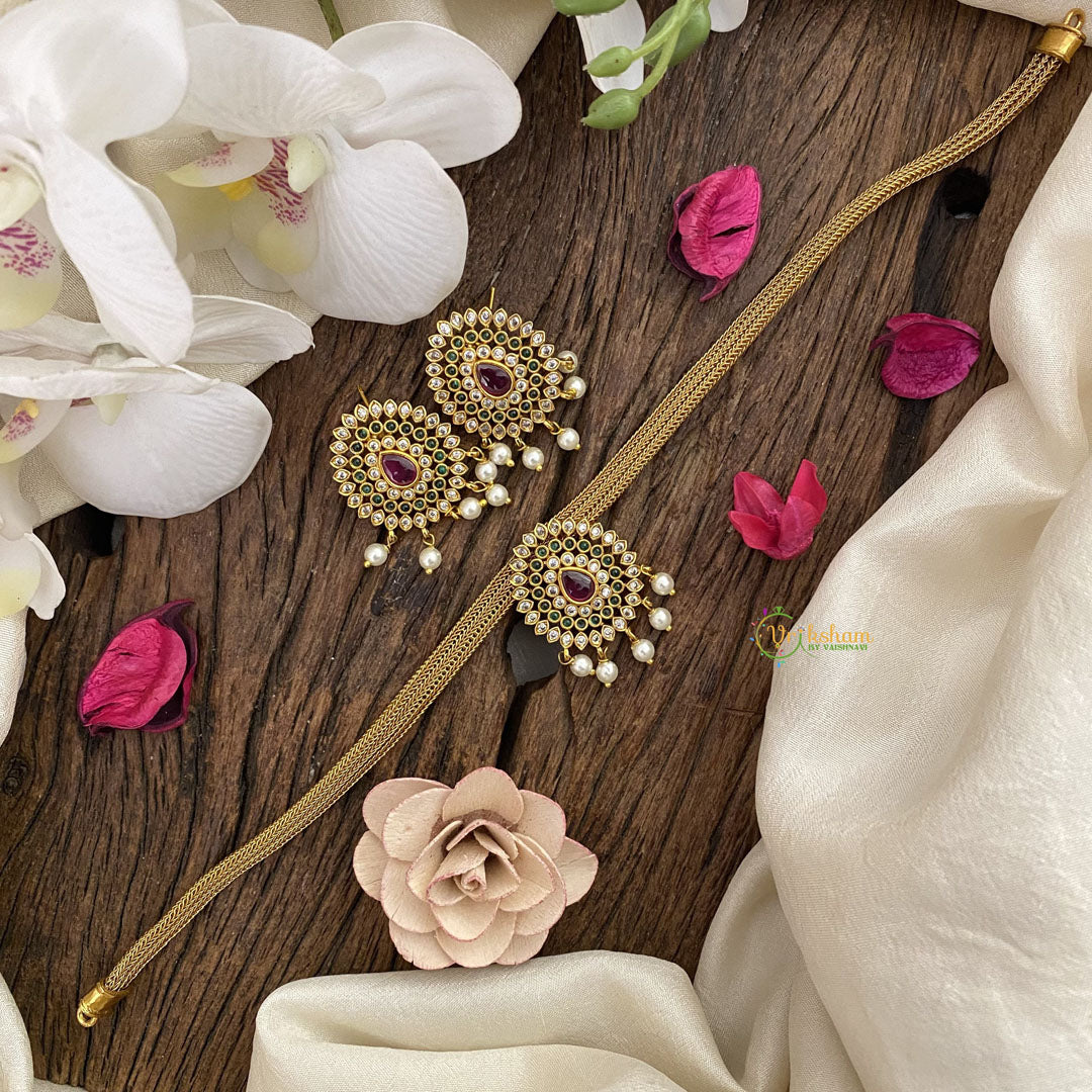 Traditional Addigai Choker Neckpiece-Tilak - Red Green -imitation stones studded pendant with plain neck chain with earrings.