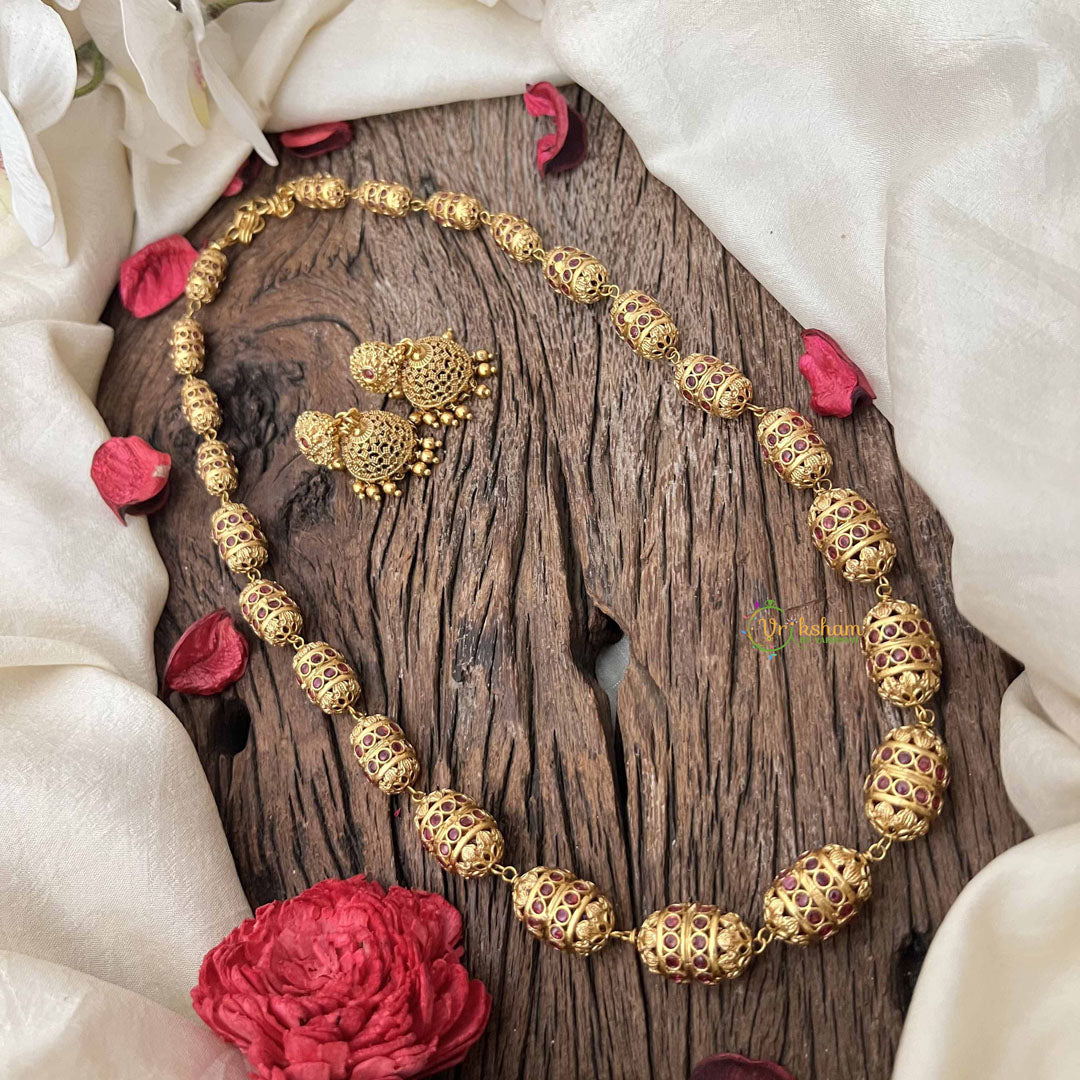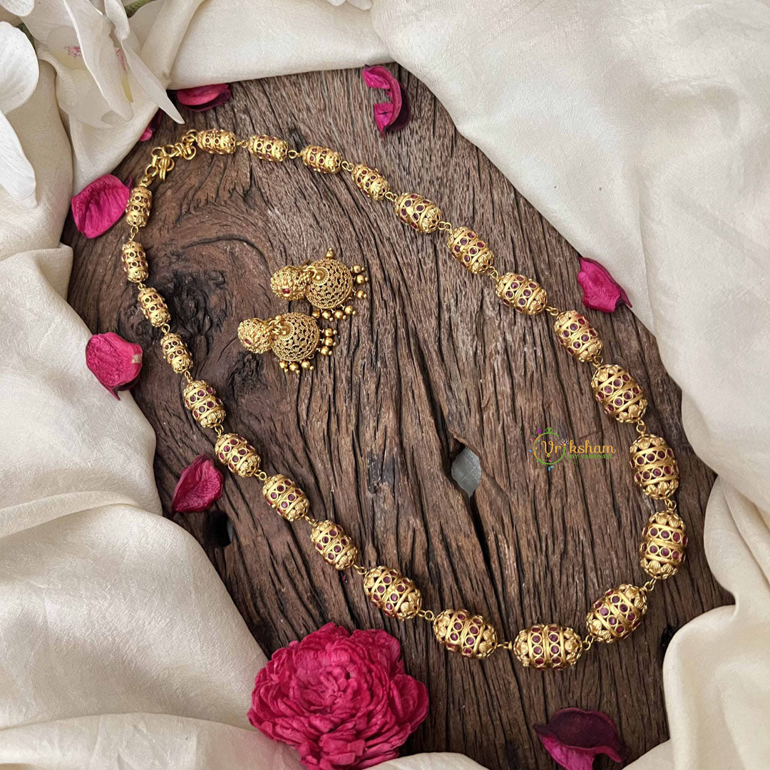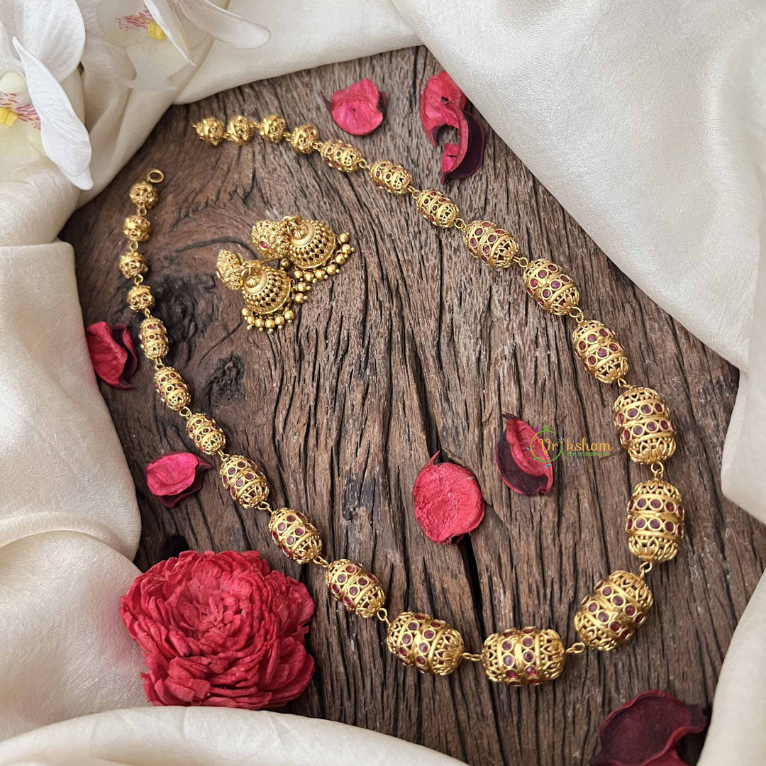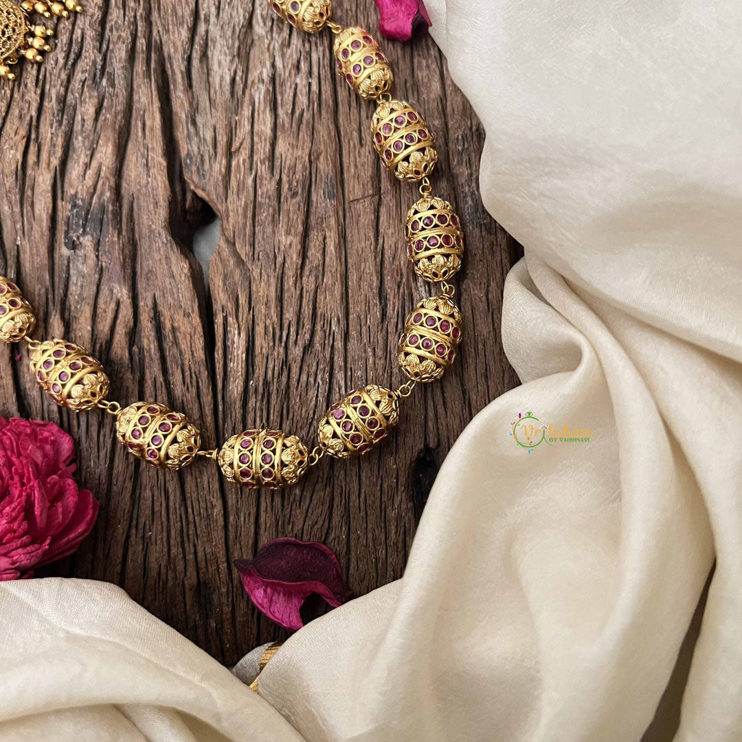 The Vriksham Traditional Bridal Gold Ruby-Inspired Beaded Neckpiece combines regal gold tones with deep ruby-inspired beads to create a captivating bridal statement. This sophisticated piece reflects timeless elegance and cultural richness, perfect for enhancing the grandeur of bridal attire.