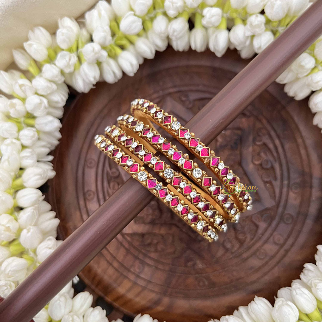 Elevate your traditional ensemble with these exquisite kundan bangles, where timeless craftsmanship meets contemporary elegance. Featuring a striking diagonal design in soft pink and pristine white, each bangle is adorned with lustrous gold enamel work and intricate kundan embellishments. The delicate silk thread detailing adds a refined texture, creating a harmonious blend of classic artistry and sophisticated style. Perfect for weddings, festivals, or special occasions, these bangles capture the essence of Indian heritage while maintaining an understated grace that complements any traditional attire.