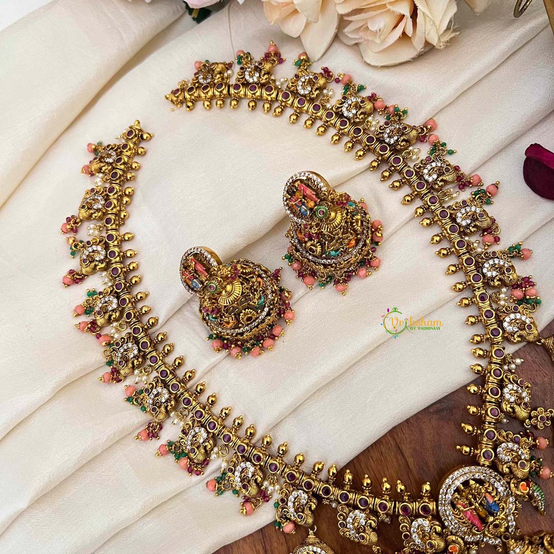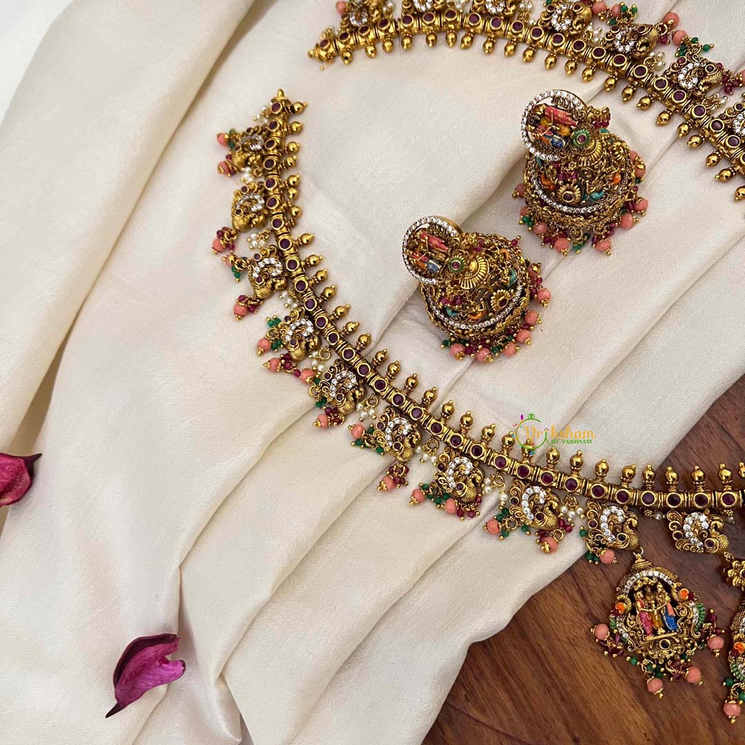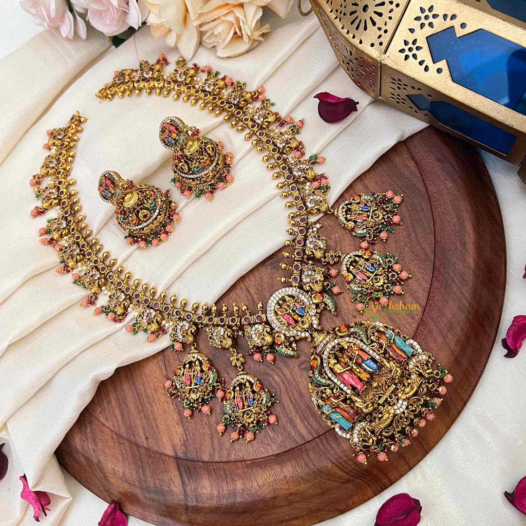 Honor tradition with this exquisite Divine Perumal enamel guttapusulu long neckpiece, a masterpiece of cultural artistry and spiritual significance. Meticulously crafted using traditional techniques, the vibrant enamel work depicts the divine form with remarkable detail and reverence. The elongated design allows for graceful draping, creating an elegant silhouette that celebrates heritage and devotion. Each element is thoughtfully rendered, showcasing the artisan's dedication to preserving authentic craftsmanship. Perfect for religious ceremonies, cultural celebrations, or those who appreciate jewelry that connects to deeper spiritual and ancestral roots. A timeless treasure that transcends fashion to become a meaningful heirloom.