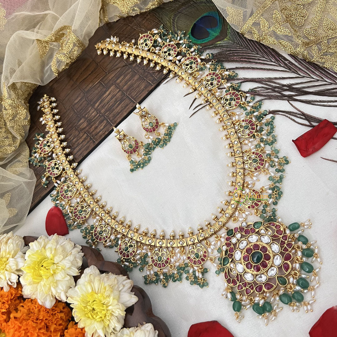 The Vriksham Traditional Dual Peacock Guttapusalu Haaram showcases intricate dual peacock motifs adorned with delicate rice pearls and vibrant green beads. This sophisticated necklace blends classic design with elegant detailing, making it an exquisite choice to complement your traditional wardrobe with timeless charm.