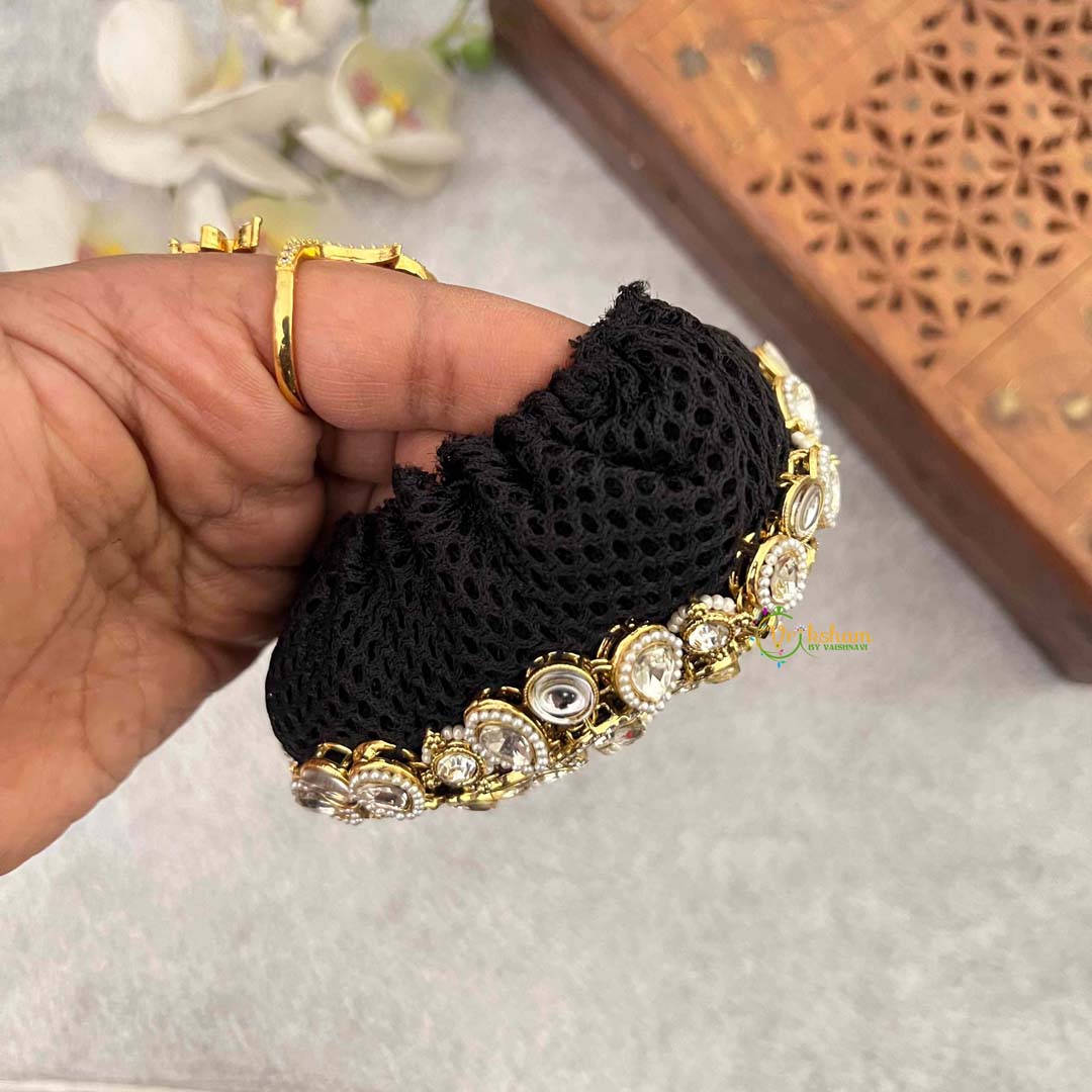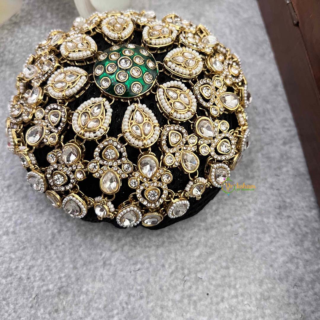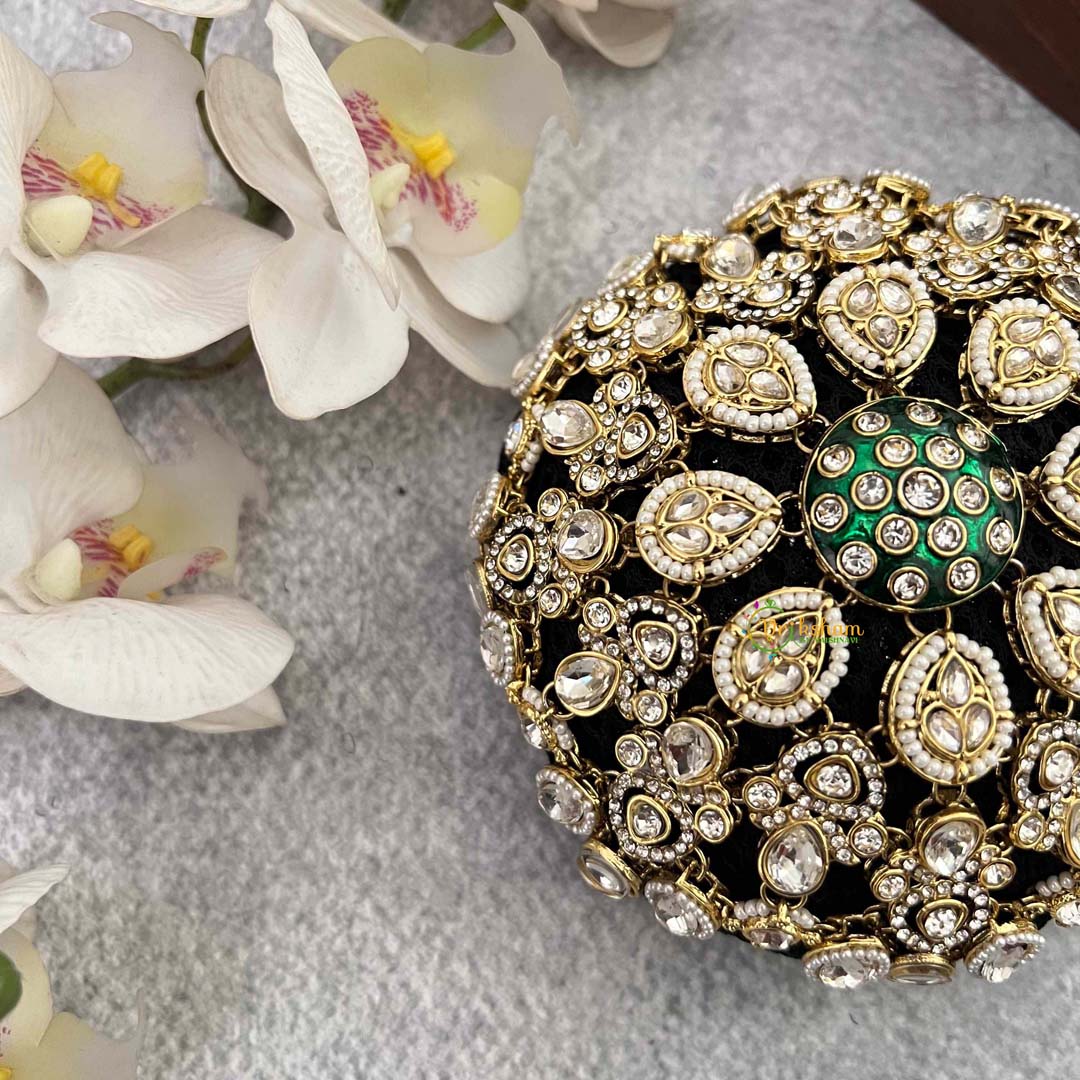 Elevate your elegance with this striking juda net, featuring a magnificent emerald green centerpiece that commands attention with its rich, jewel-toned allure. The verdant focal point is complemented by traditional detailing that honors heritage craftsmanship while maintaining contemporary appeal. This refined bun cage accessory provides secure hold and comfort, allowing the emerald centerpiece to take center stage as a statement of sophisticated taste. Perfect for weddings, festive occasions, and cultural celebrations, this piece merges bold color with timeless design, offering a distinctive alternative for those seeking to express individuality through jewelry-quality hair accessories.