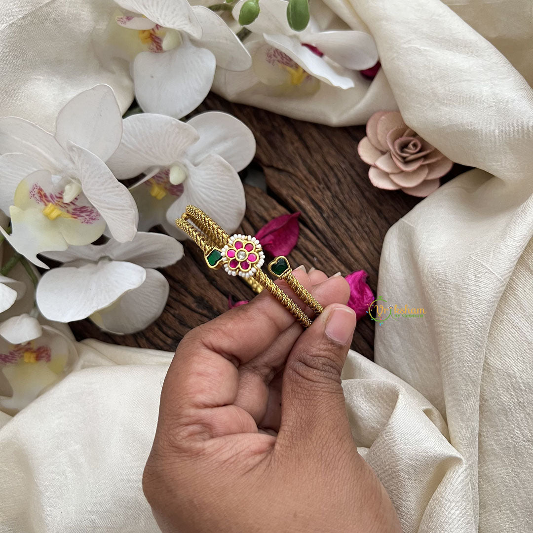 The Vriksham Traditional Floral Enamel Openable Kada in red, white, and green showcases exquisite craftsmanship with its vibrant enamel floral design. This openable kada combines traditional artistry with ease of wear, making it a refined accessory that adds a subtle yet striking touch to any outfit. Perfect for those who appreciate timeless elegance with a modern twist.