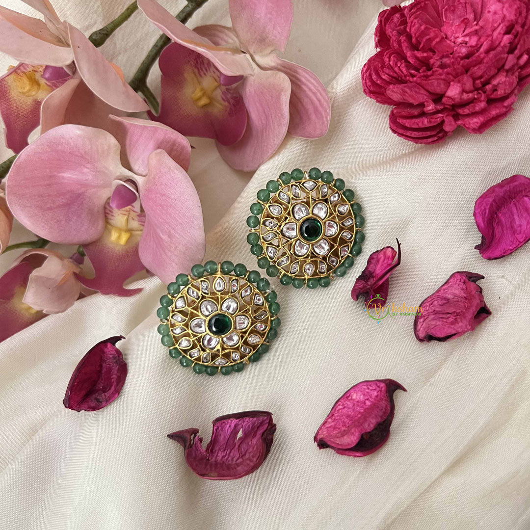 Elevate your elegance with the Vriksham Traditional Floral White Kundan Stud Earrings, featuring exquisite emerald green accents. These refined earrings blend classic floral motifs with the timeless brilliance of white kundan, accented by vibrant emerald touches that add a subtle pop of color. Perfect for both festive occasions and sophisticated gatherings, they offer a graceful complement to your traditional ensemble. Handcrafted with attention to detail, these studs provide a delicate yet striking statement of heritage and style.