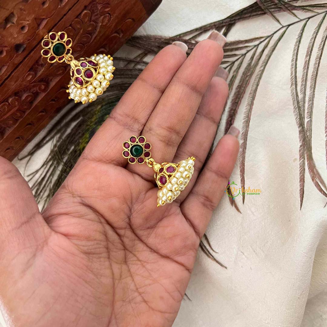 Indulge in the allure of these traditional floral jhumka earrings, adorned with lustrous ruby and emerald kemp stones that capture light with mesmerizing brilliance. The intricate floral design showcases authentic craftsmanship, with each stone carefully positioned to create a harmonious balance of color and radiance. Perfect for those who appreciate classic Indian jewelry, these sophisticated earrings bring timeless elegance to any occasion, from festive celebrations to cherished moments that call for refined adornment.