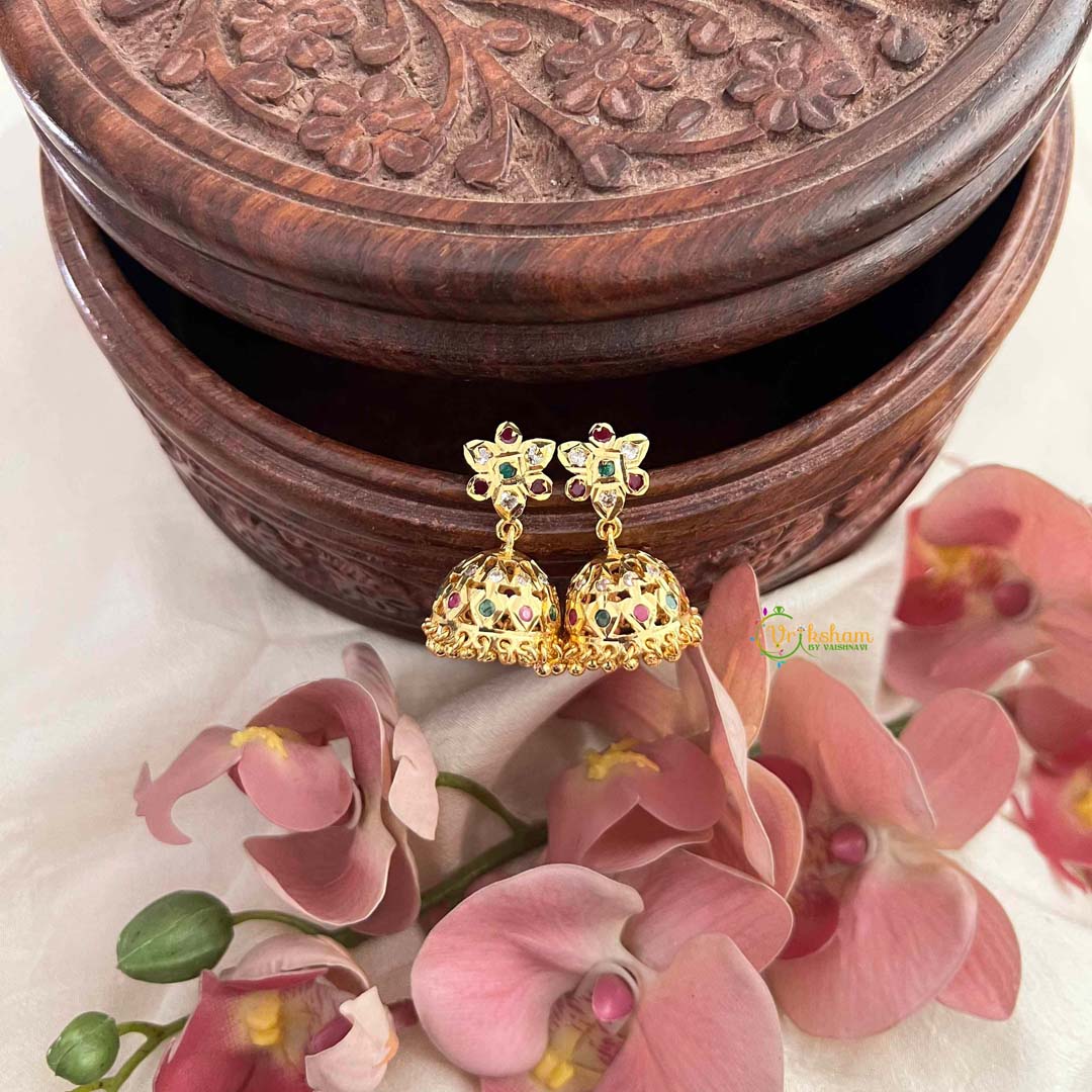 Elevate your jewelry collection with these elegant floral jhumka earrings, featuring a stunning tri-color composition of ruby, emerald, and white kemp stones. The intricate floral patterns are brought to life through expertly placed gemstones that create a luminous, multifaceted aesthetic. These refined earrings embody traditional craftsmanship with a contemporary sensibility, making them an exceptional choice for those seeking versatile pieces that transition beautifully from festive occasions to refined everyday elegance.