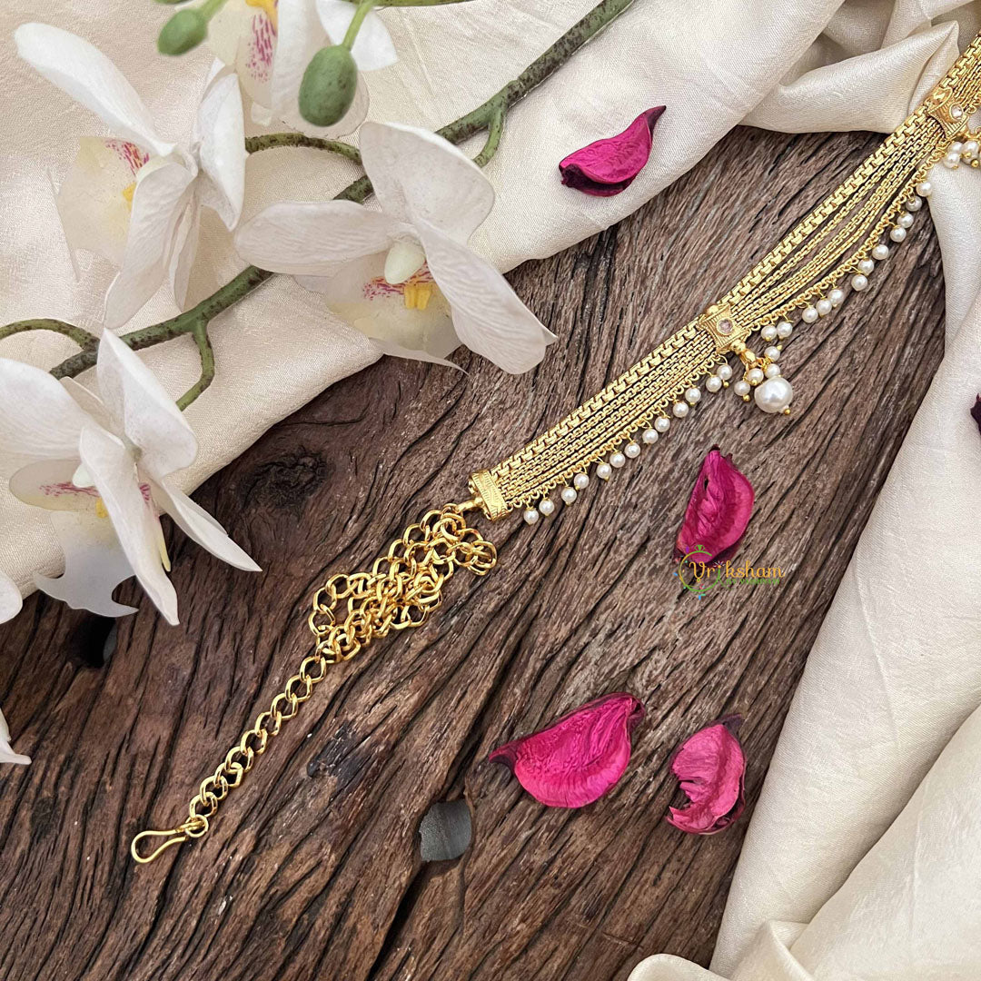 Celebrate heritage craftsmanship with this traditional gold five-layered and pearls drop champ hipchain, adorned with pristine white pearls. The intricate five-layer construction creates remarkable depth and visual richness, while luminous white pearls cascade gracefully throughout the design. Each layer is thoughtfully crafted to catch and reflect light beautifully, creating an enchanting shimmer. The warm gold finish honors traditional aesthetics while maintaining contemporary elegance. This exceptional accessory appeals to those who appreciate jewelry rooted in cultural significance and superior artistry. An heirloom-worthy piece that celebrates timeless beauty and refined personal style.