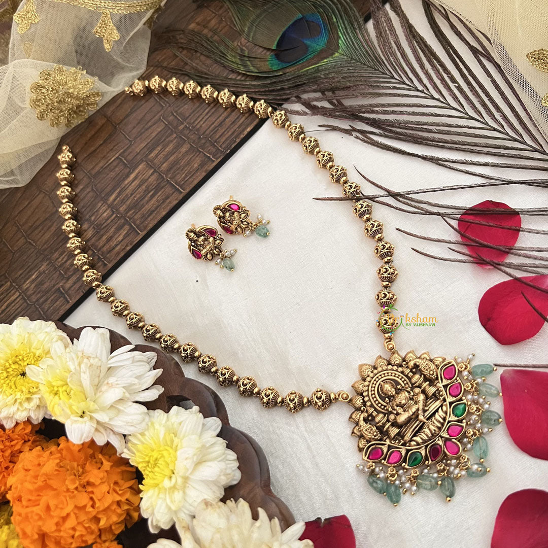 The Vriksham Traditional Gold Lakshmi Pendant Haram Neckpiece features a beautifully crafted Lakshmi pendant accented with vibrant green beads. This sophisticated piece blends classic gold tones with traditional design, making it an elegant choice to enhance your festive and formal attire.