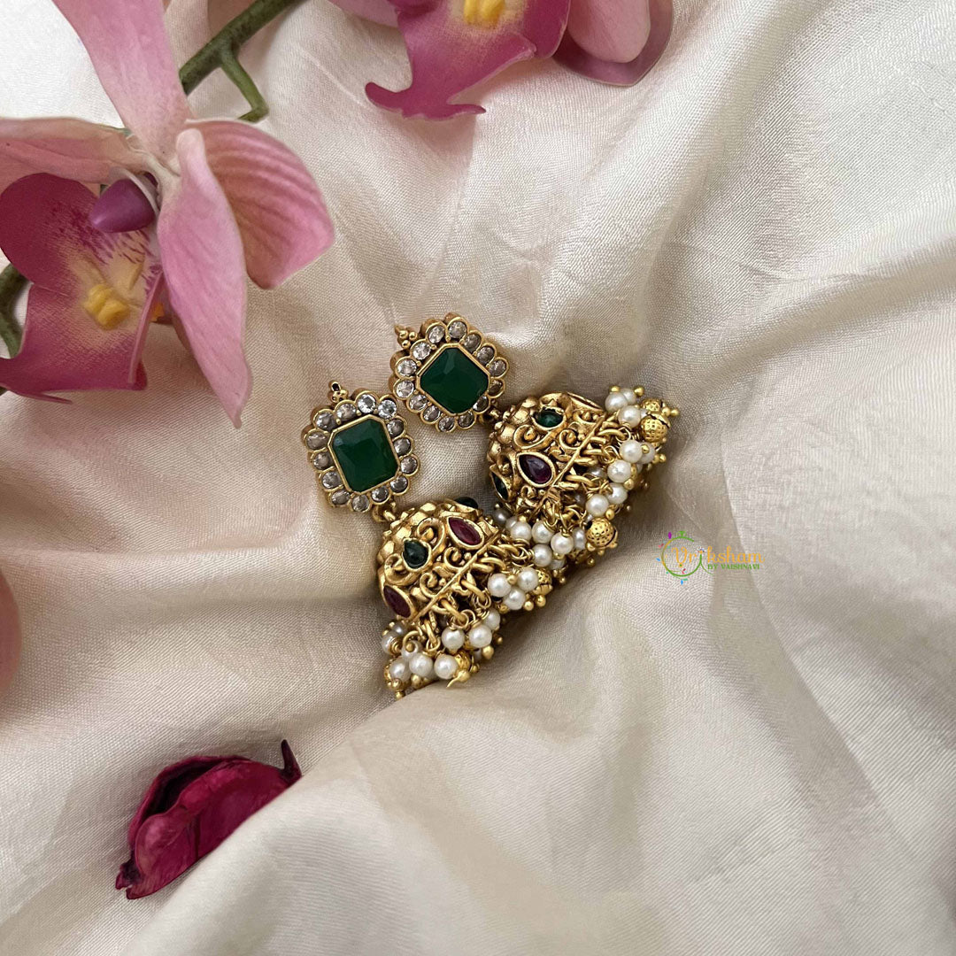 Elevate your ethnic ensemble with these exquisite dome jhumka earrings, crafted to capture the timeless allure of traditional gold. Adorned with lustrous green pearls, each piece features an elegant curved design that gracefully frames the face. The sophisticated gold-toned finish pairs seamlessly with the rich emerald hue of the pearls, creating a harmonious blend of classic and contemporary aesthetics. Perfect for festive occasions, weddings, or adding a touch of refined elegance to your everyday wear. These statement earrings embody the essence of traditional Indian jewelry with a modern sensibility.