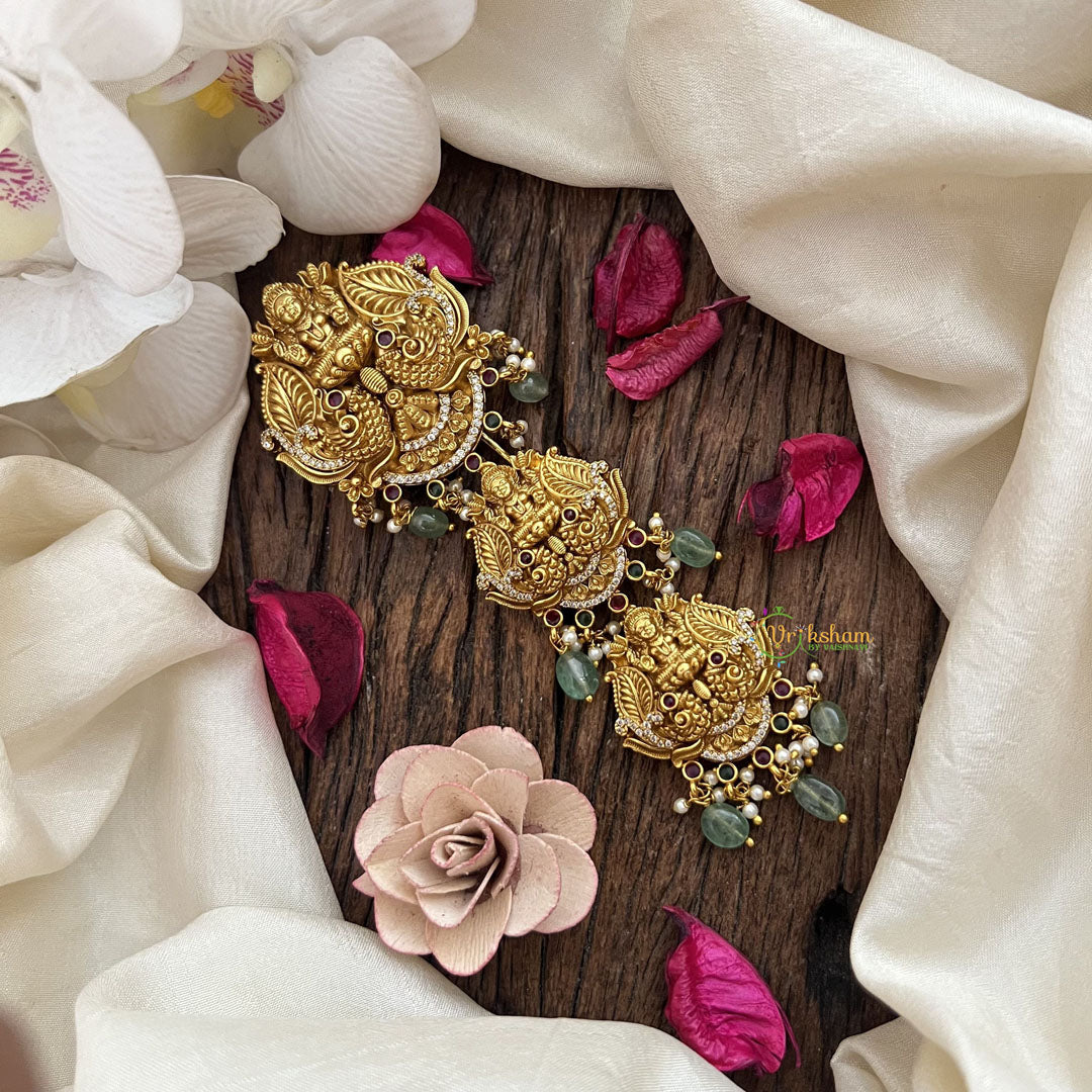 The Vriksham Traditional Gold Plated Lakshmi 3 Layer Jada Billai with Green Beads combines classic elegance with intricate craftsmanship. Featuring a three-layered design adorned with a detailed Lakshmi motif and vibrant green beads, this sophisticated hair ornament adds a graceful and auspicious touch to your traditional ensemble.