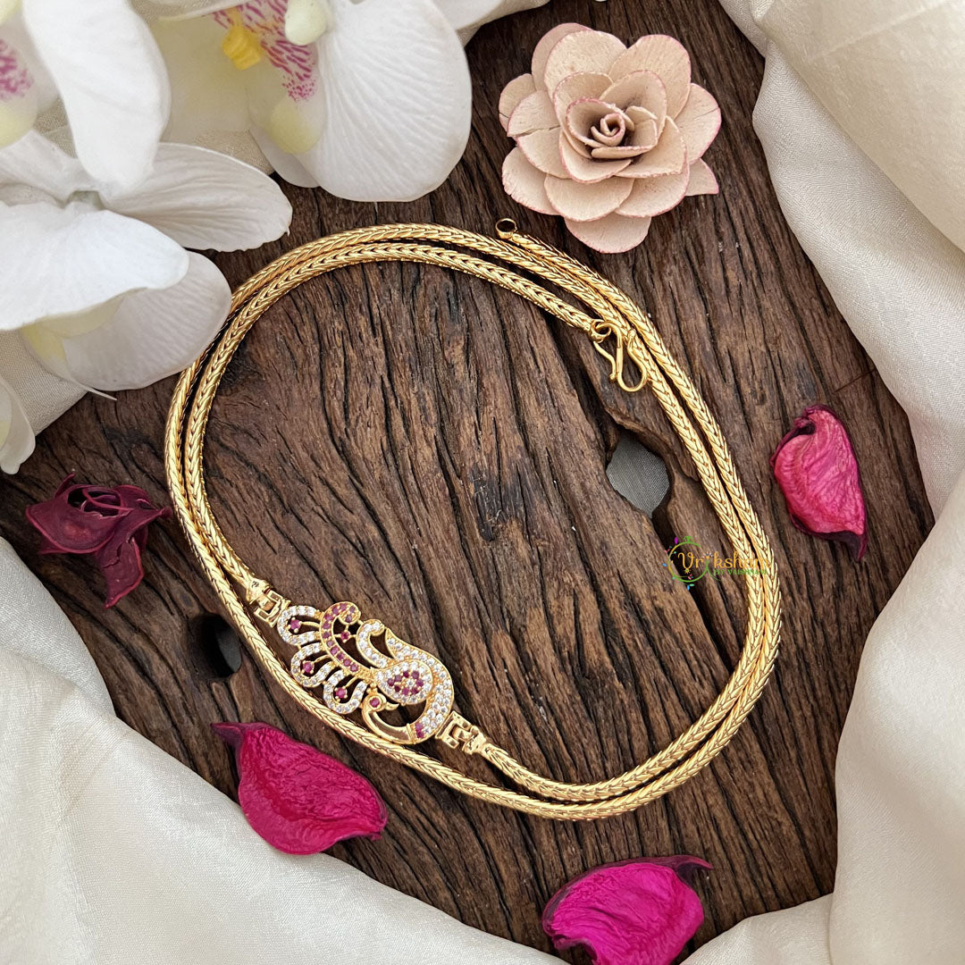 Introducing the Vriksham Traditional Gold Polish Peacock Moggapu Chain-White Red, a stunning piece of jewelry that exudes elegance and luxury. Made with premium quality materials, this chain features a beautiful peacock design and a rich gold polish. Elevate your style with this exclusive and timeless accessory.