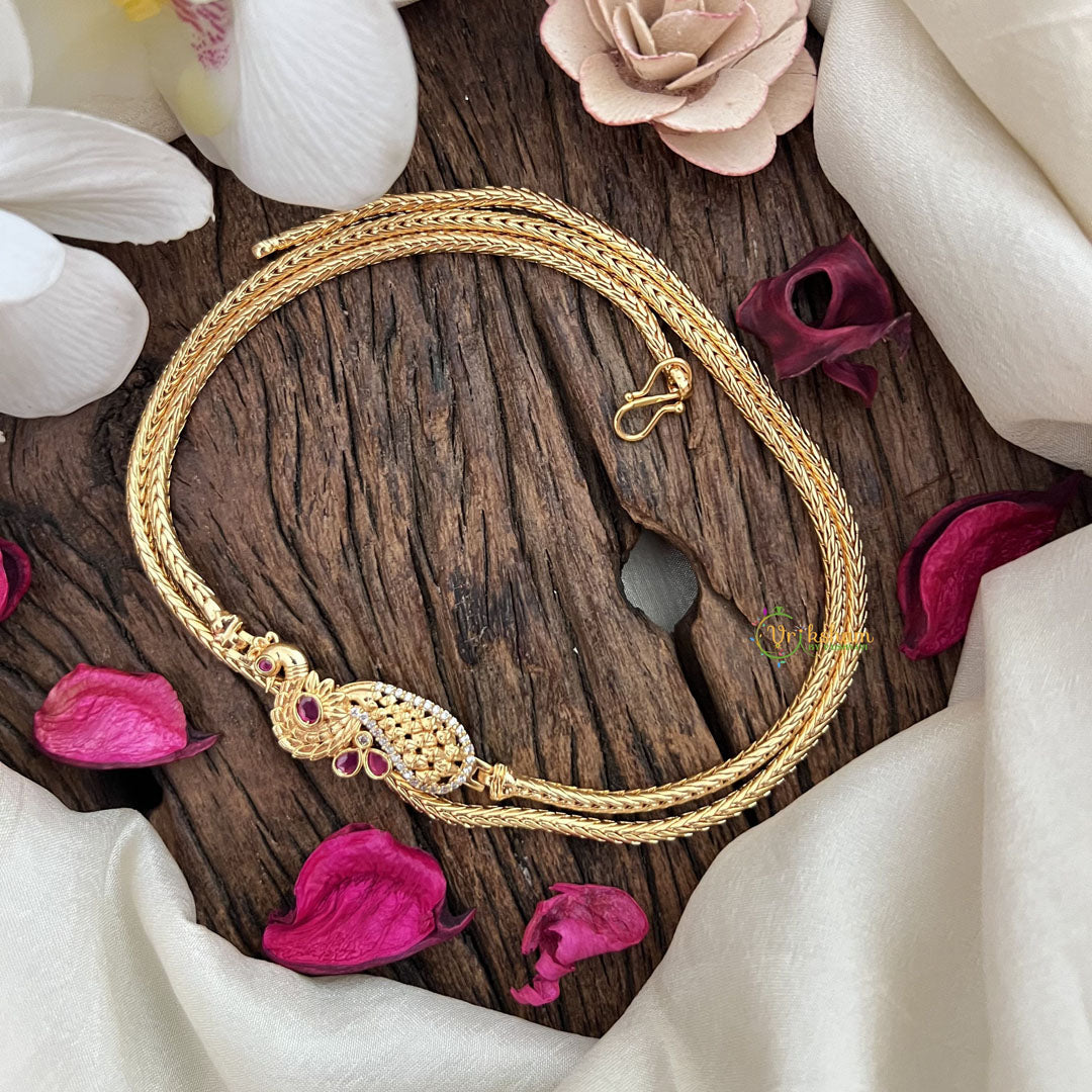 Introducing the Vriksham Traditional Gold Polish Peacock Moggapu Chain-Red, a stunning piece of jewelry that exudes elegance and luxury. Made with premium quality materials, this chain features a beautiful peacock design and a rich gold polish. Elevate your style with this exclusive and timeless accessory.