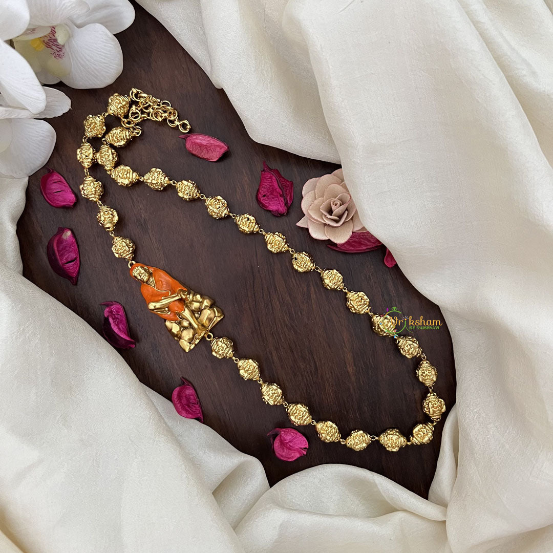 Adorn yourself with the exquisite Vriksham Traditional Gold Polish Sai Baba Mogappu Chain. Showcasing delicate Lakshmi motifs, this chain is expertly crafted with a luxurious gold polish. Elevate your style with this stunning piece that embodies elegance and sophistication. A must-have for any discerning jewellery collection.
