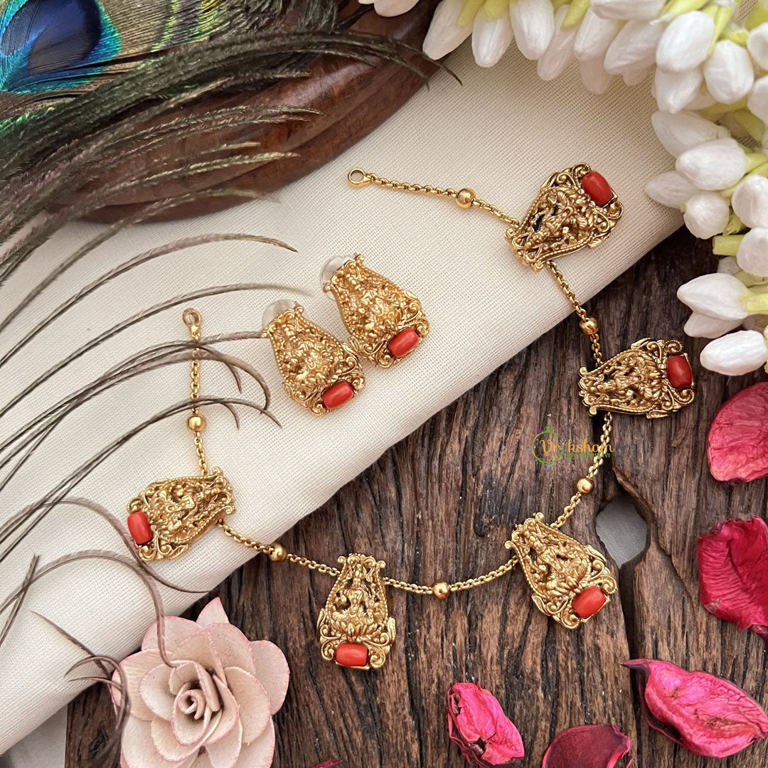 The Vriksham Traditional Gold Neckpiece features a beautifully detailed deity pendant accented with vibrant coral stones. This piece combines classic craftsmanship with spiritual symbolism, making it a distinguished accessory for formal occasions or cultural celebrations. Its rich gold finish and intricate design offer a timeless elegance that complements refined tastes.