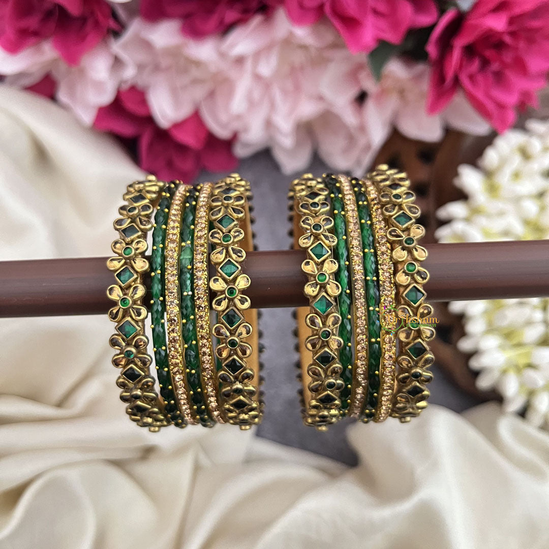 Elevate your traditional ensemble with the Vriksham Traditional Green & Gold Floral Kundan Silk Thread Bangle Set. Expertly crafted, this set combines rich green and gold hues with intricate floral Kundan detailing, wrapped in luxurious silk thread. Perfect for adding a refined touch to festive or special occasions, these bangles offer timeless elegance and a comfortable fit.